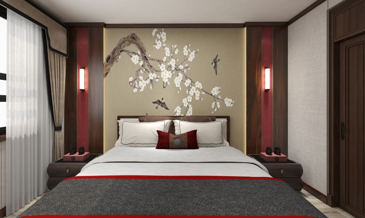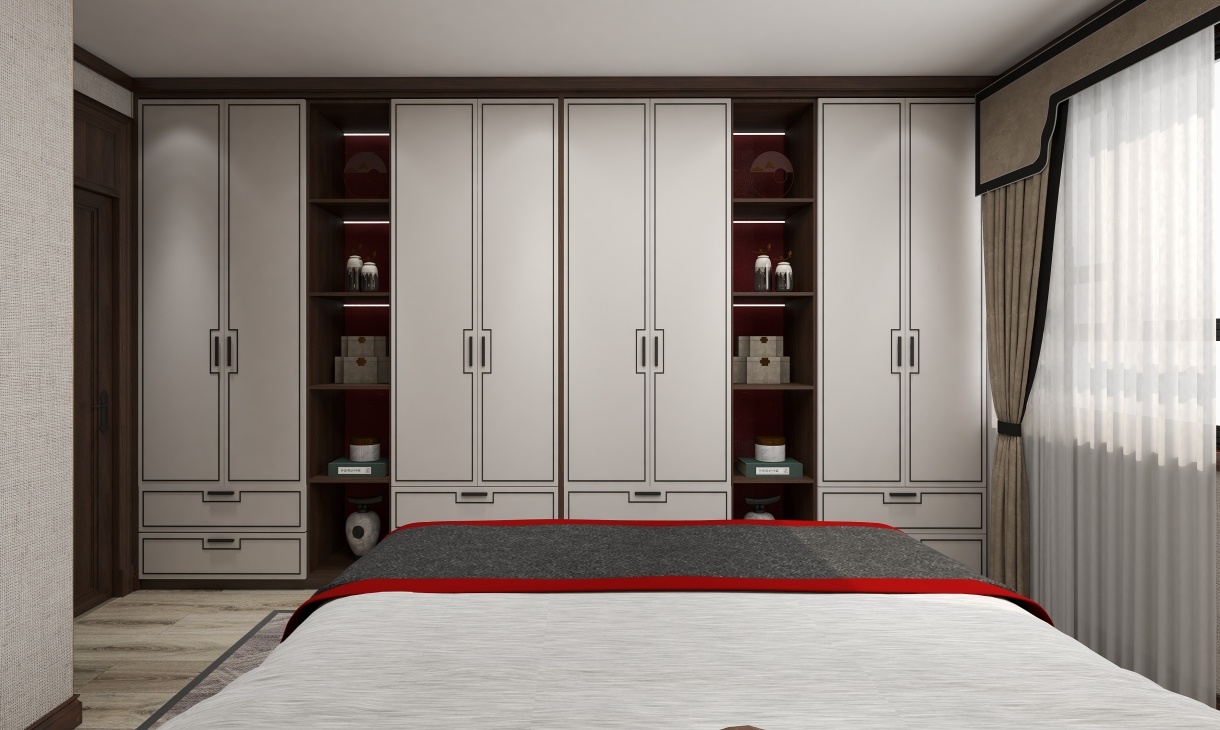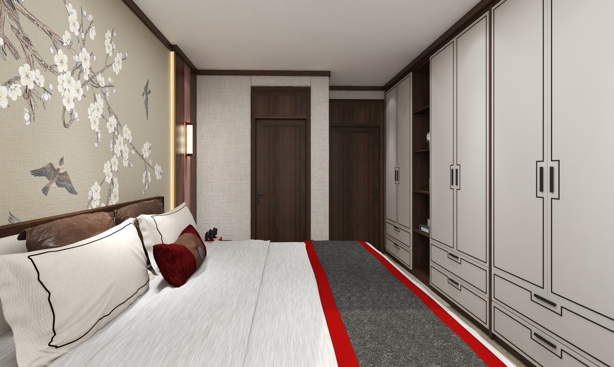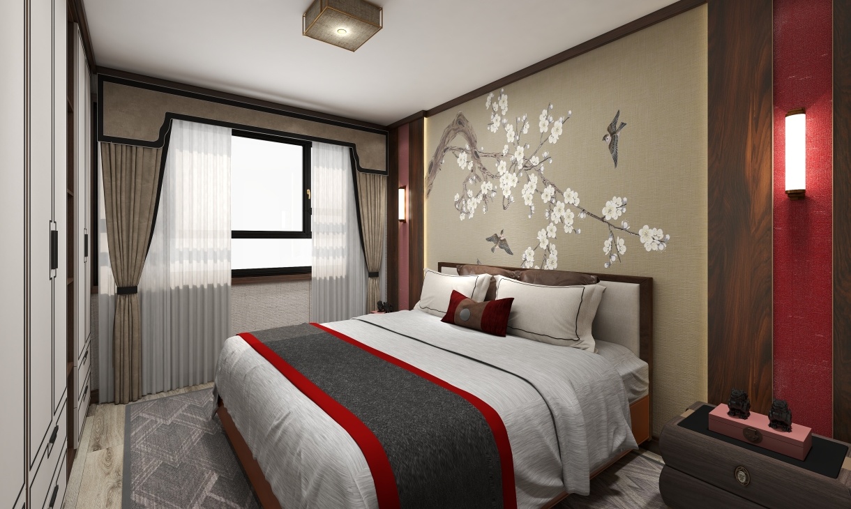 床品、窗簾、床頭背景墻等裝飾顏色相呼應,整體色調偏向素雅為主,與整體氣質和諧統一,巧妙地將傳統美感與現代簡潔相融合。