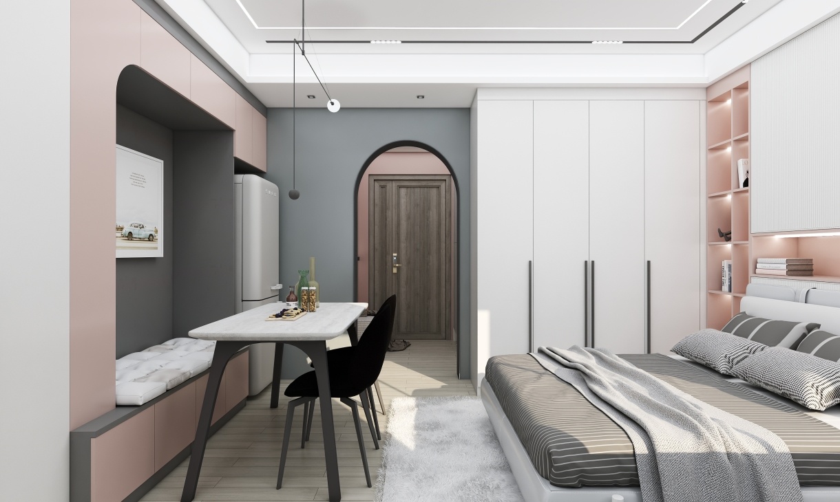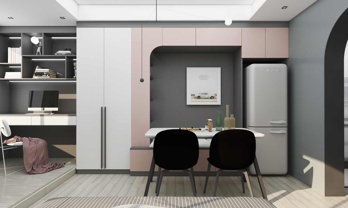 卡座式的餐廳搭配到頂收納柜,一居室也能整潔大氣,轉角處放置冰箱實用又美觀,白色+馬卡龍粉色時尚加倍。