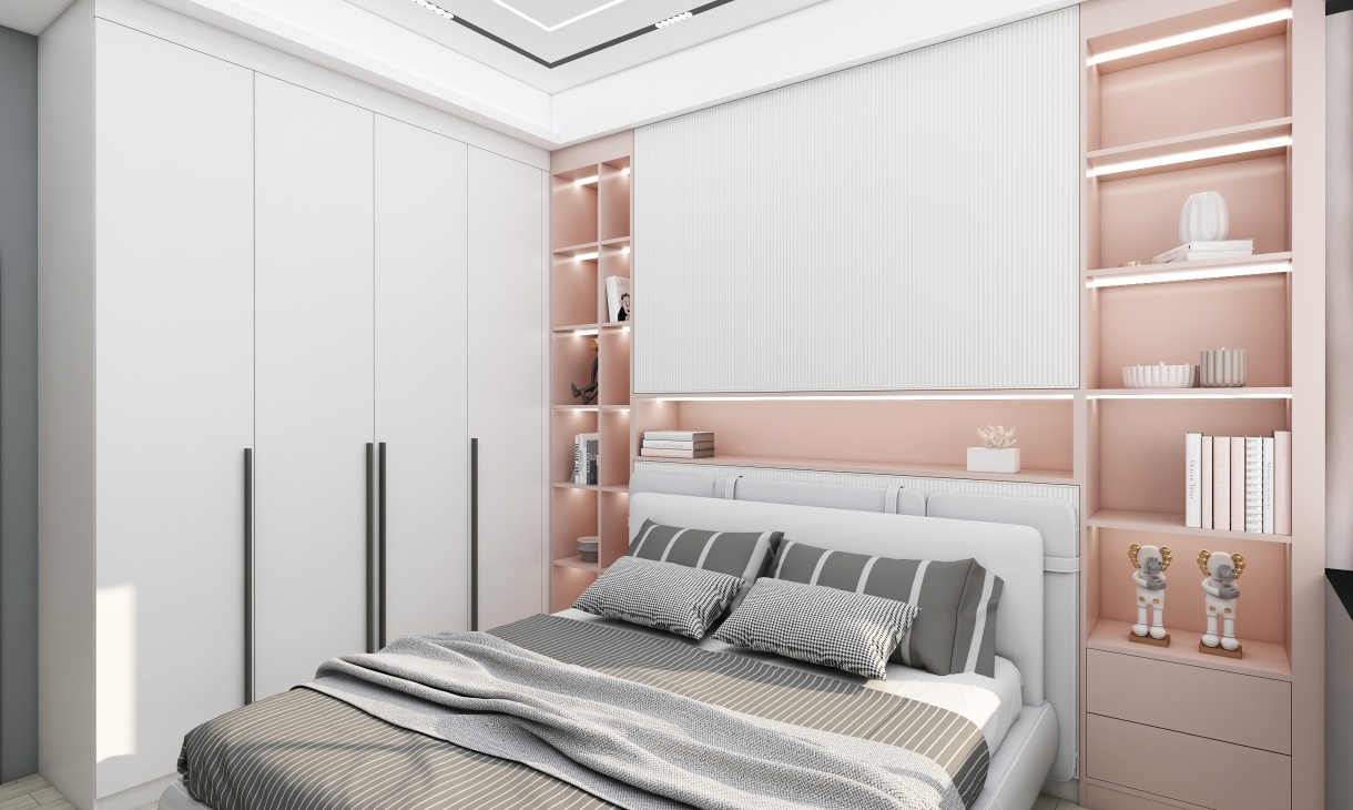 一居室最重要的就是臥室,白色+馬卡龍粉色時尚溫馨,臥室的床頭背景墻設計成實用性的收納柜,彰顯格調。