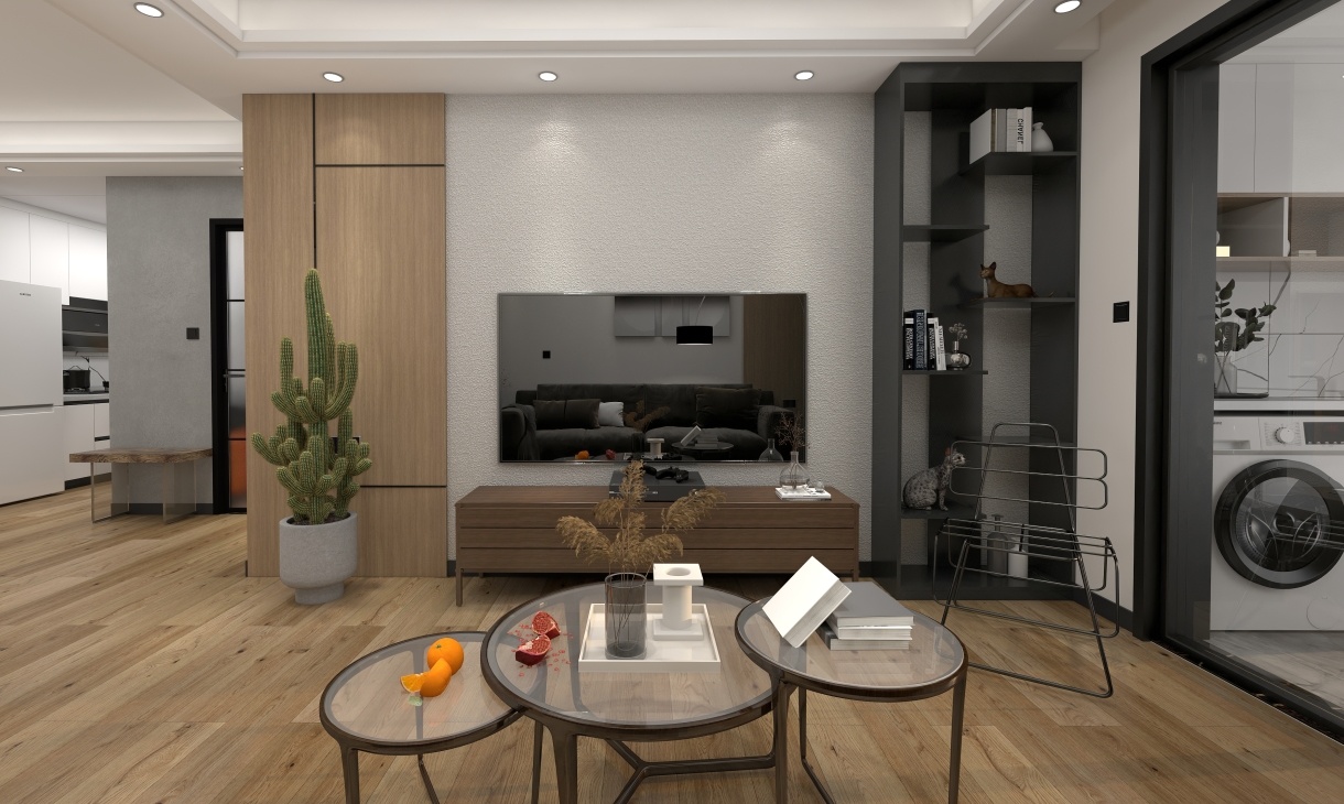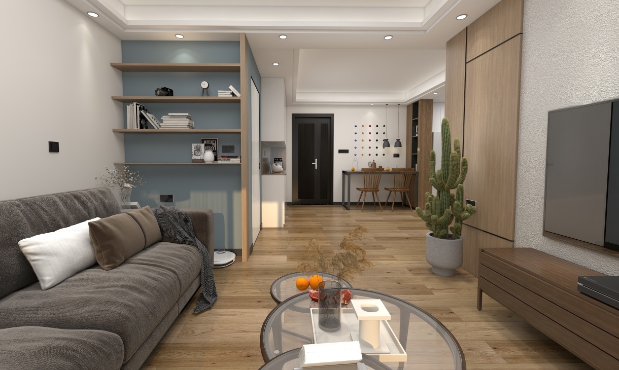 簡約風深受年輕人的喜好,簡易書架式隔斷搭配木質電視柜,讓整個空間清新自然,客餐廳的開放式布局讓空間大氣通透,實用性更高。