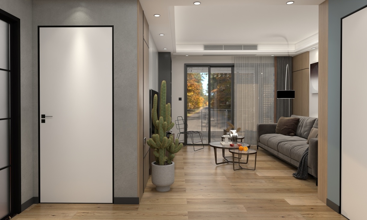 灰色的墻面搭配落地大窗次豐富且美觀,簡潔的灰色沙發搭配木地板和裝飾環繞整個家居空間,時尚舒適。