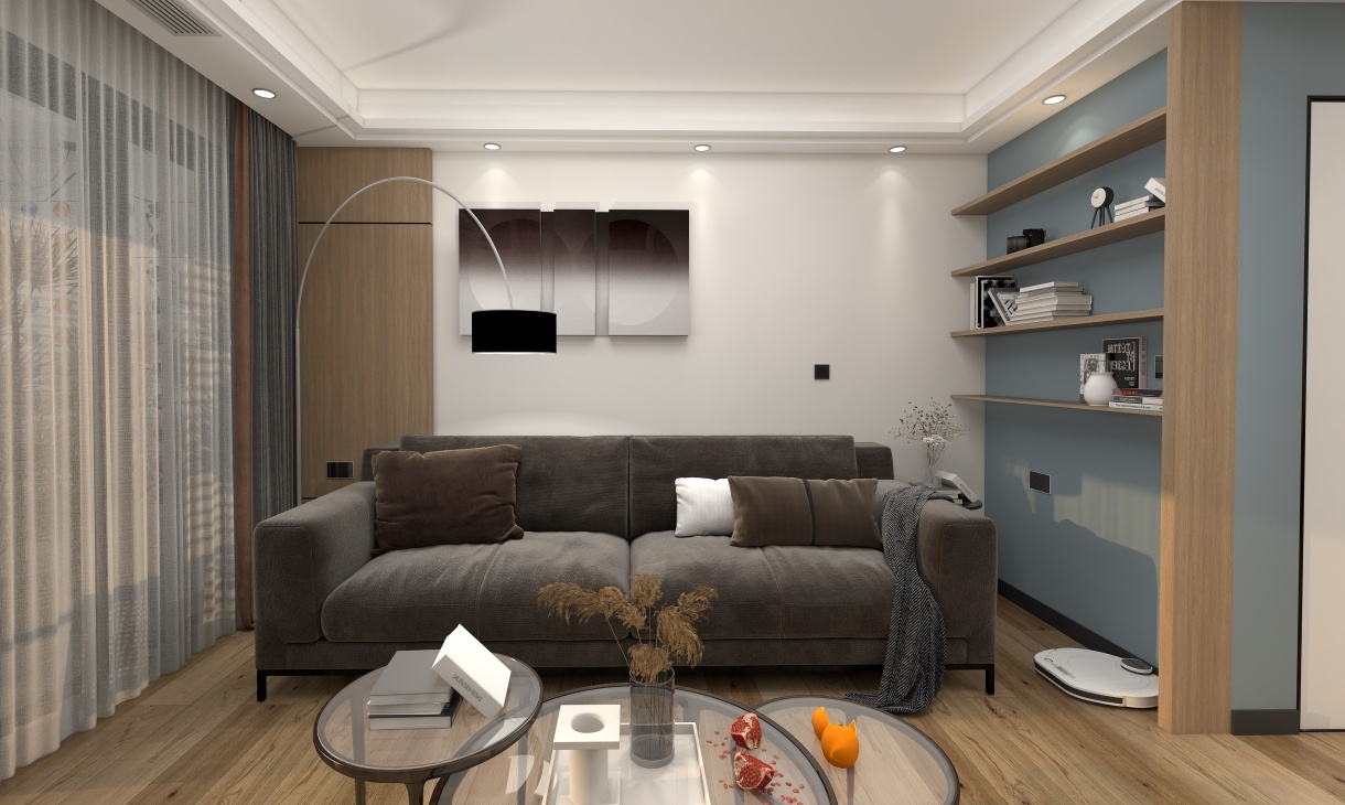 客廳的沙發背景墻以時尚為主,側邊設計多功能收納架,既滿足客廳物品收納又很美觀,灰色的沙發搭配木地板舒適不沉悶。