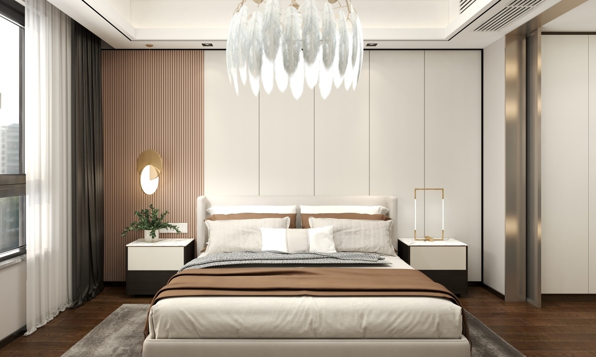 臥室整體風(fēng)格簡(jiǎn)潔大氣,羽毛吊燈充滿設(shè)計(jì)感,滿足居住者的少女心,電視背景墻的木材拼接設(shè)計(jì)顯得舒適大氣。