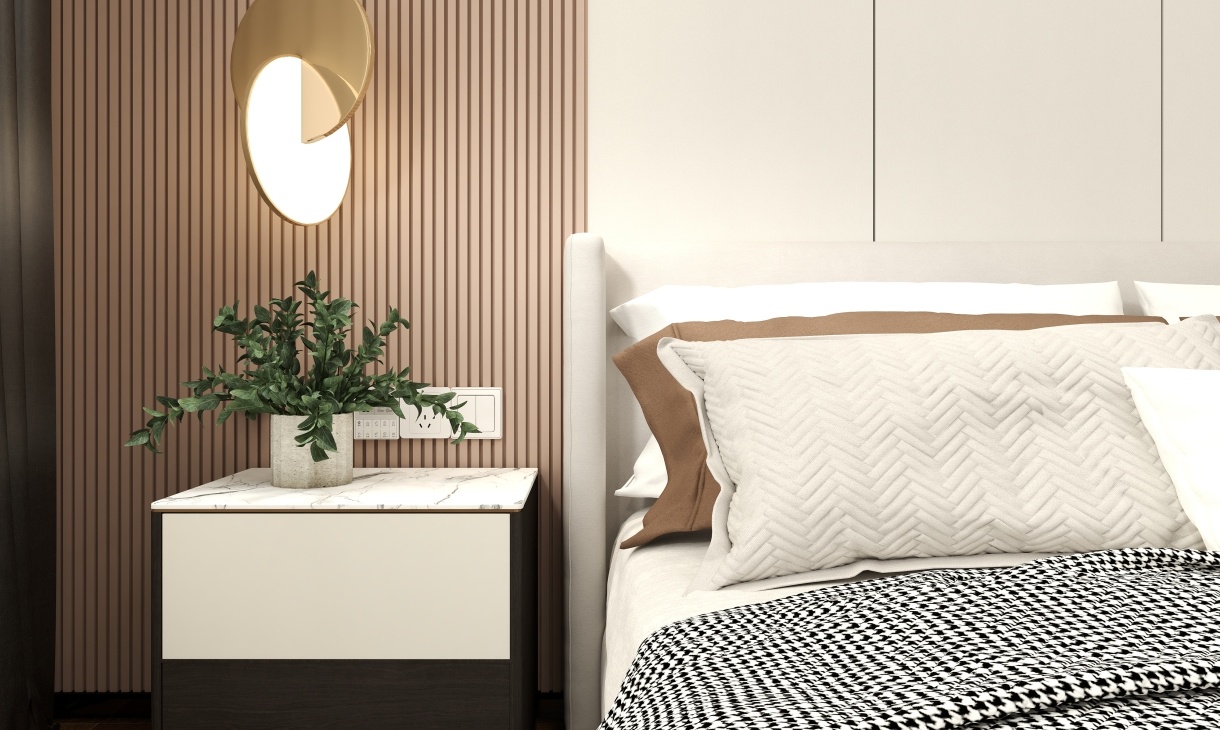 床頭柜上擺放了綠植點(diǎn)綴,還能增加了一些擺放物品的空間,簡(jiǎn)約大氣的吊燈既不占用空間,又起到了很好的裝飾作用。