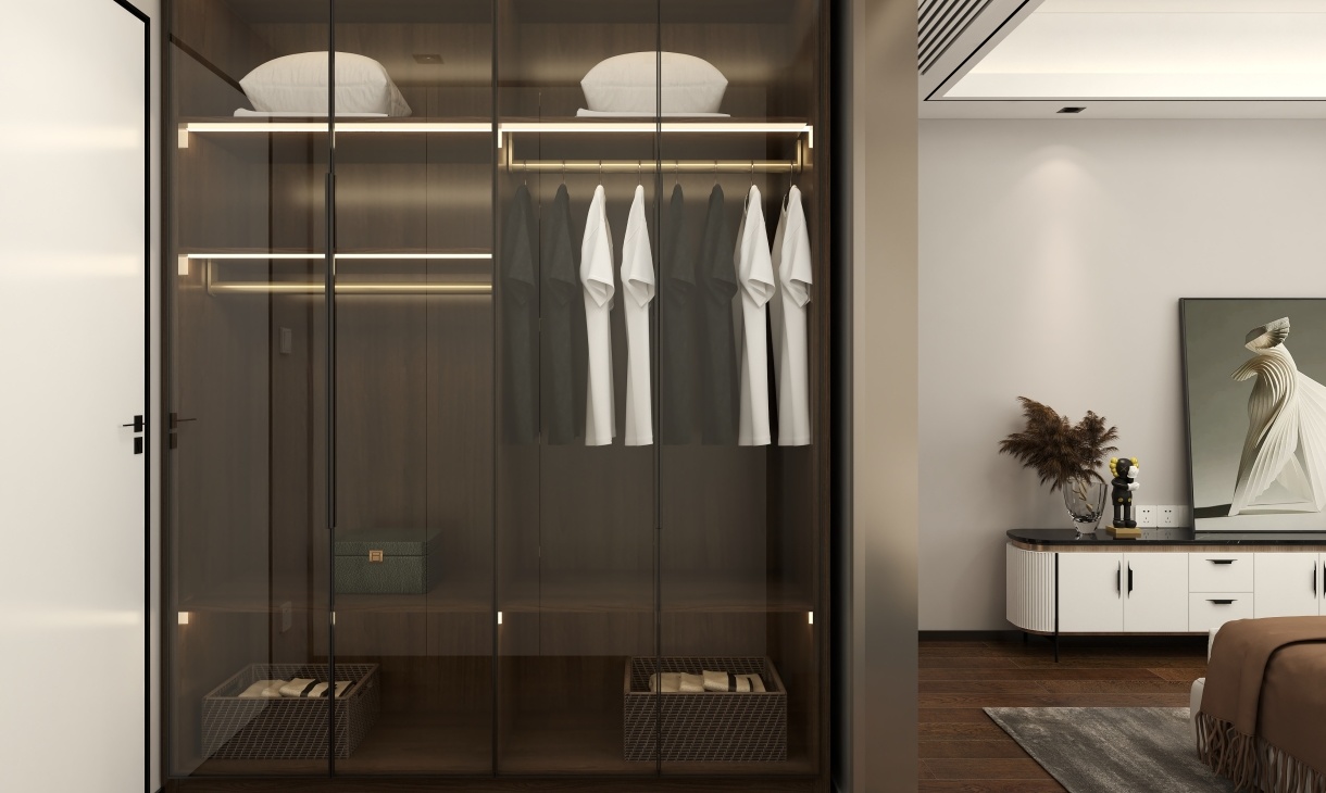 陽(yáng)臺(tái)處設(shè)計(jì)到頂衣柜,玻璃柜門增加通透性,設(shè)計(jì)精巧的感應(yīng)燈帶安裝在衣柜的內(nèi)部,提升空間格調(diào)。