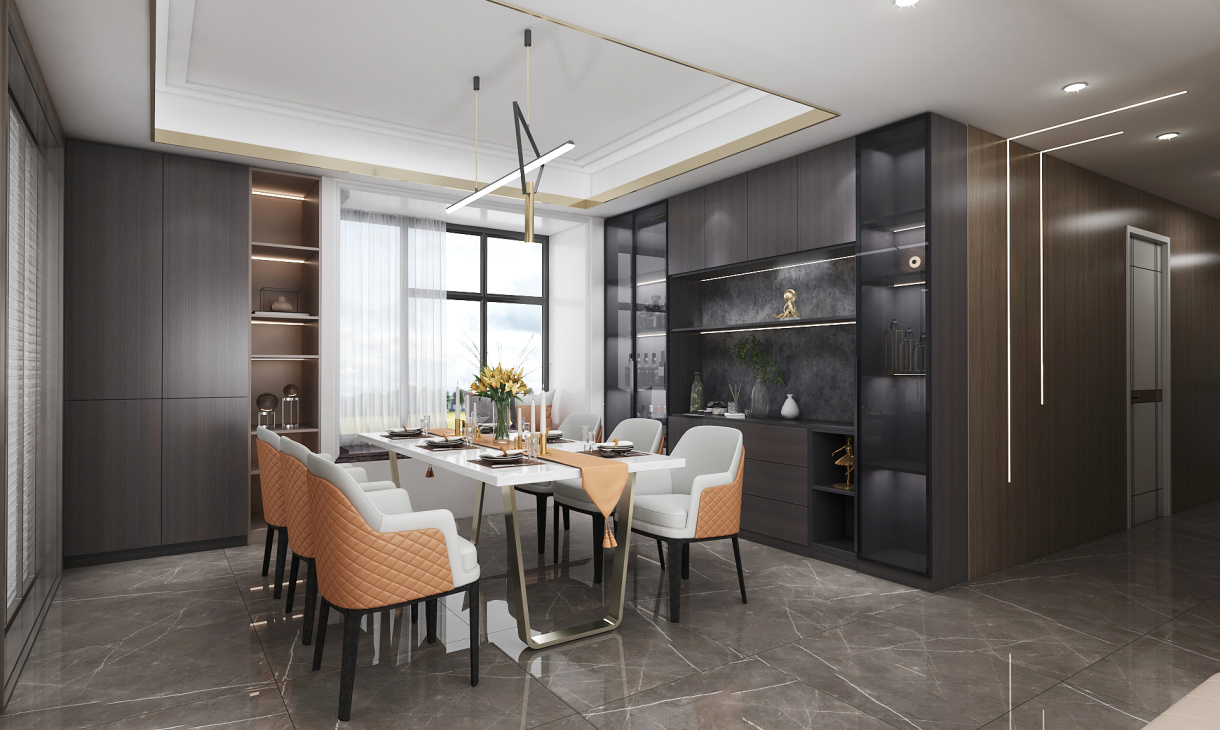 餐桌和餐椅的搭配明亮大氣,深色的餐邊柜更顯質感十足,靠近窗戶處設計收納柜增添收納能力又很美觀。