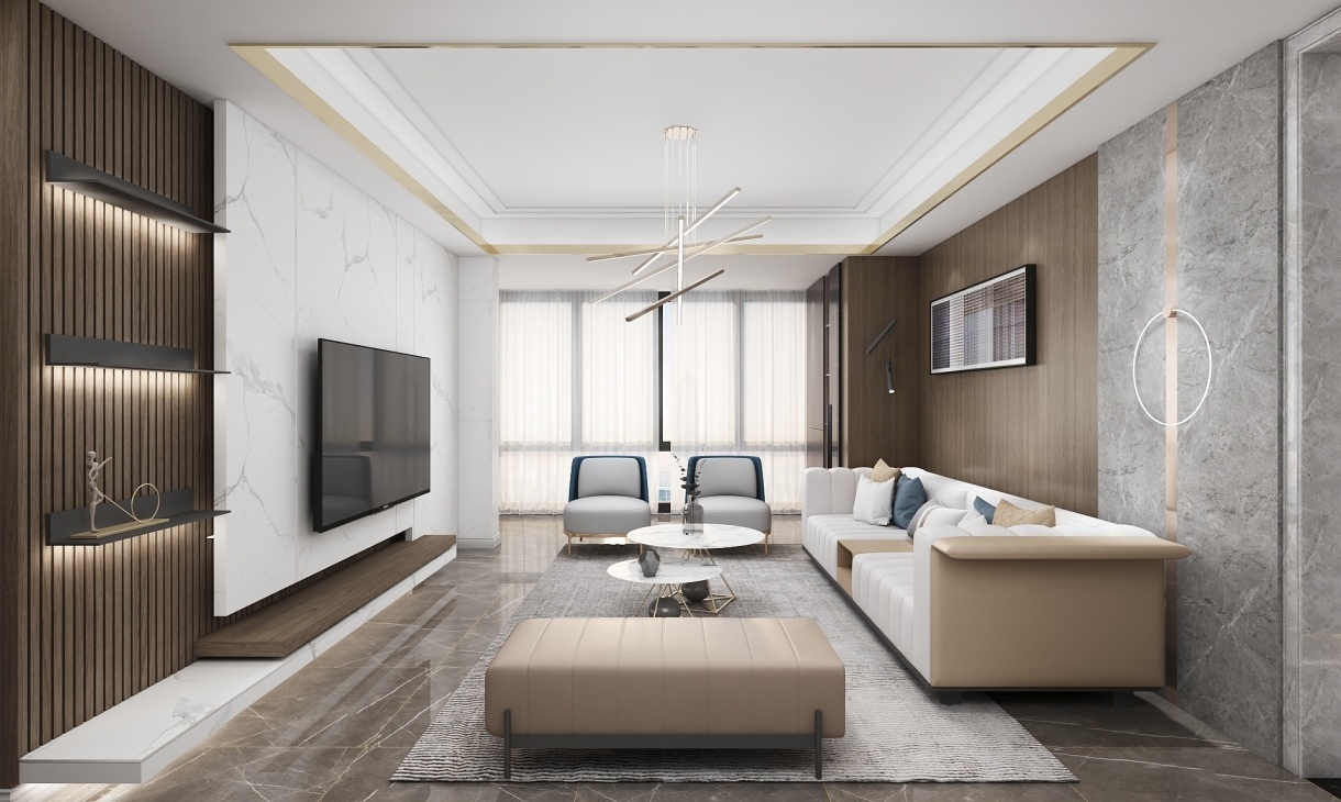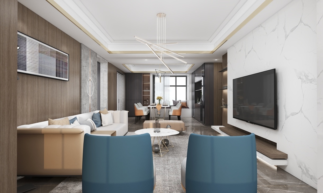 原木色搭配大理石的設計讓客餐廳簡潔大氣,電視柜一體化設計滿足空間的格調需求,沙發背景墻木材與大理石拼接設計,舒適有品位。