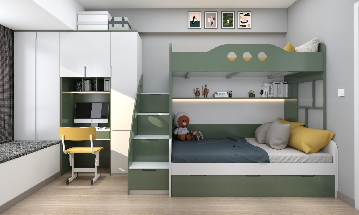 上下鋪的設計既滿足孩子的居住需求,抽屜式臺階和床底設計成收納柜實用加倍,上鋪護欄作圓弧處理,安全又美觀。