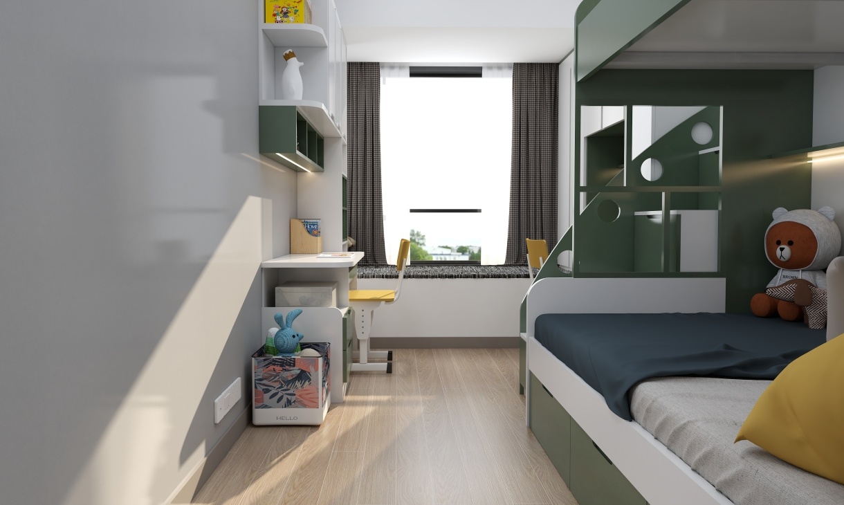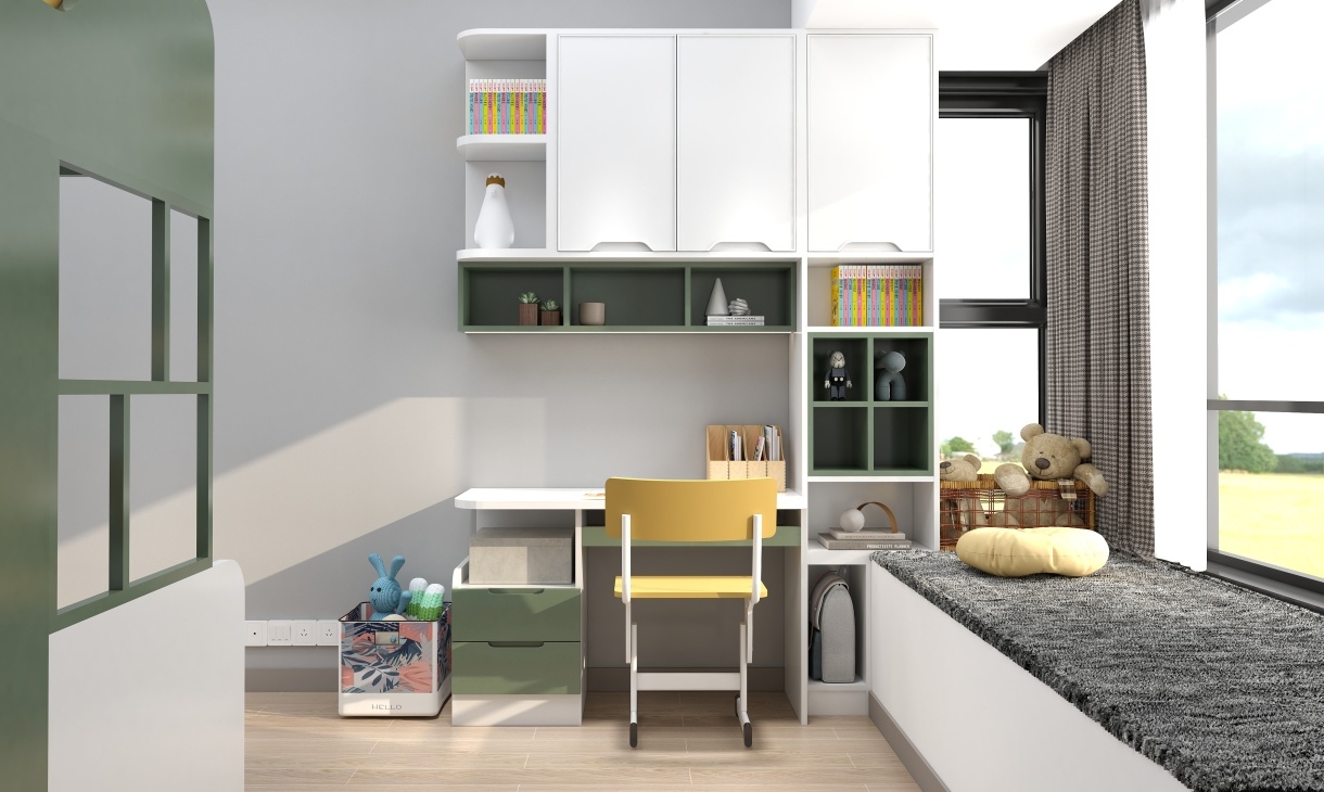 在兒童房的裝修上父母都想把最好的給孩子,綠色清新亮麗還能緩解視力疲勞,靠近窗戶設計書桌組合實用又美觀,結合娛樂飄窗為孩子營造一個溫馨又安全的成長空間。