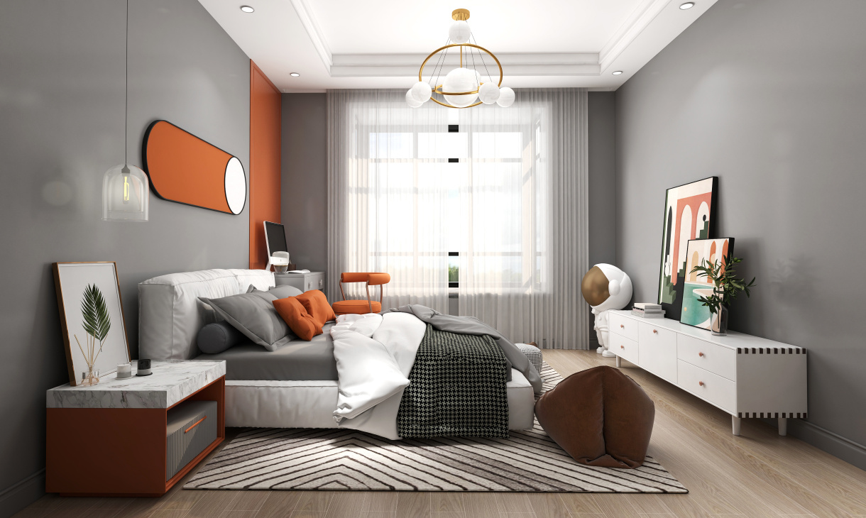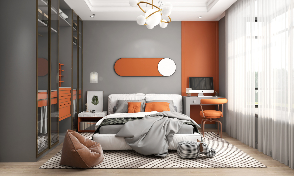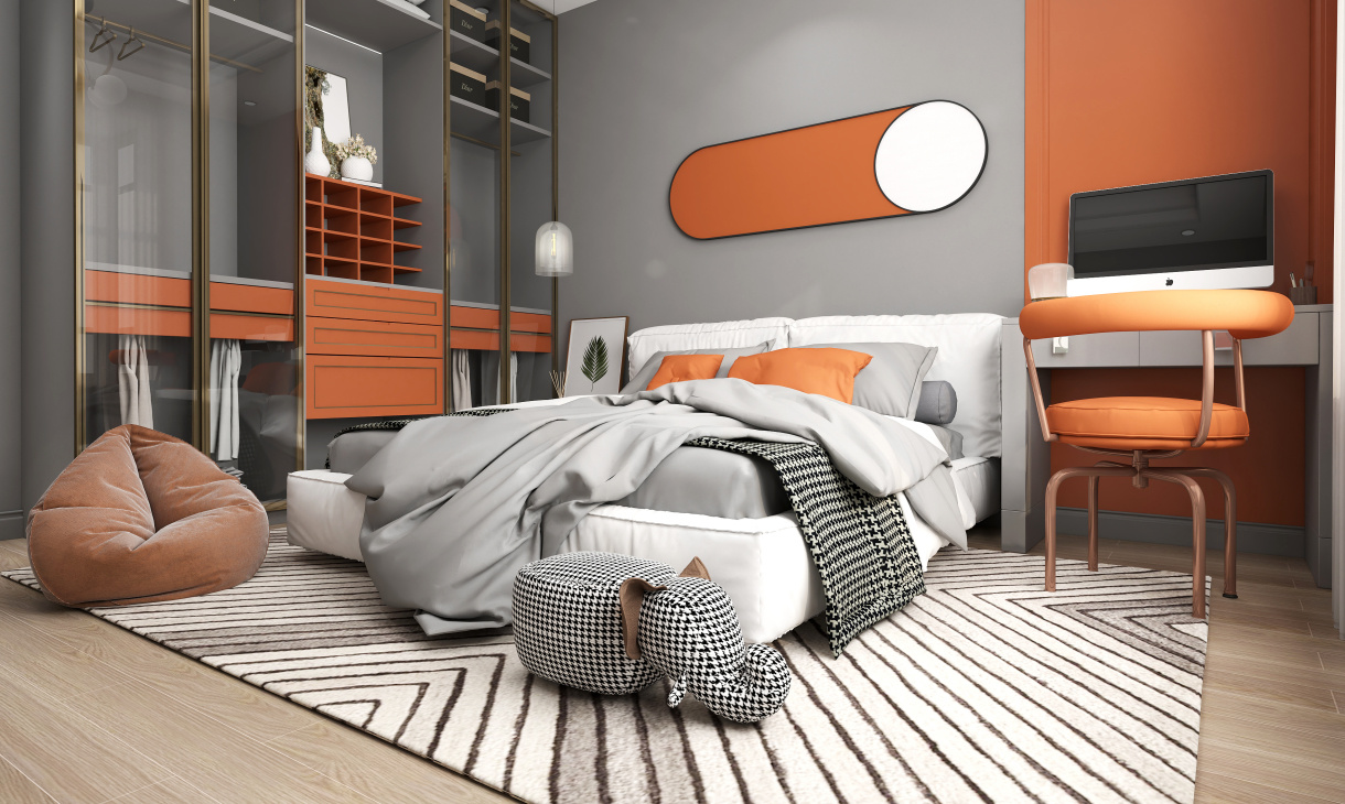 兒童房的整體布局非常簡潔大氣,淺灰色搭配亮橙色明亮?xí)r尚,定制到頂的衣柜采用玻璃柜門,既增加的收納能力,又很通透實(shí)用。