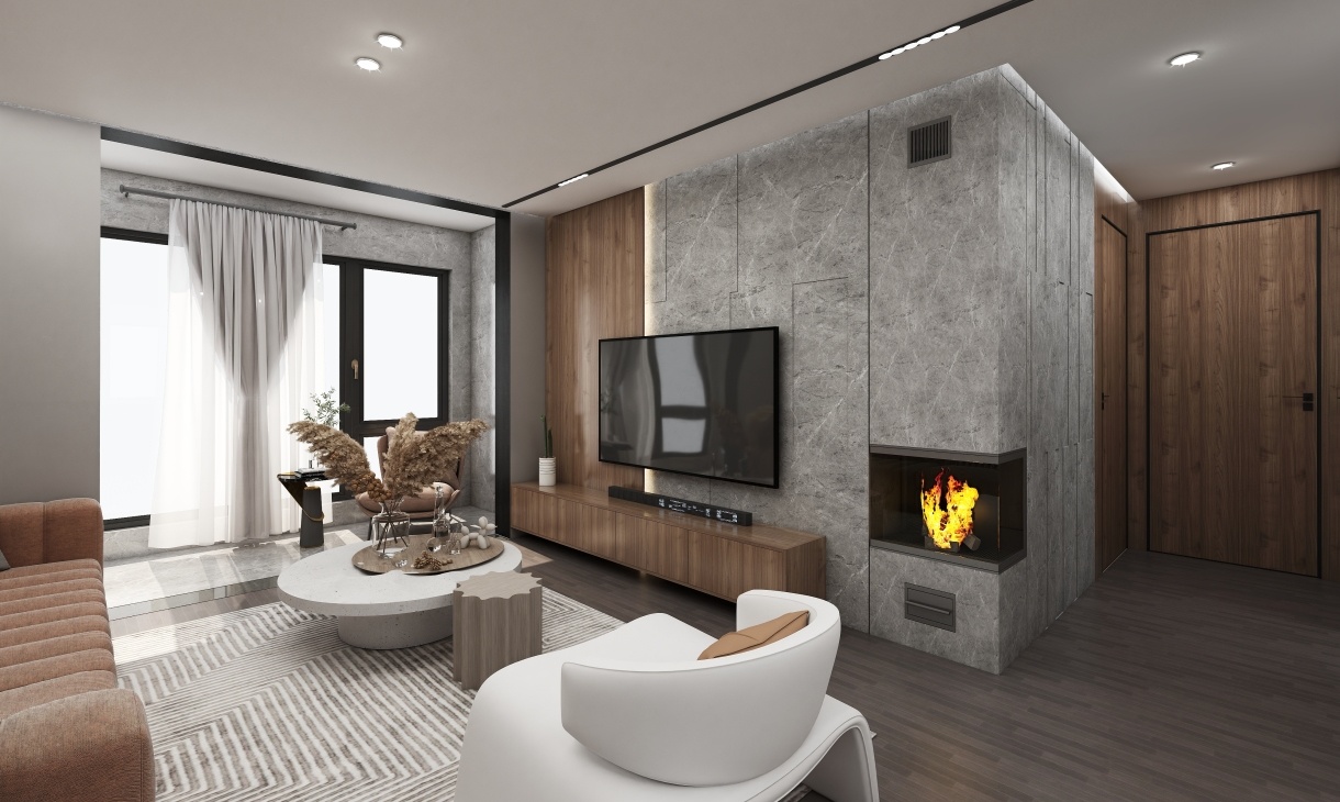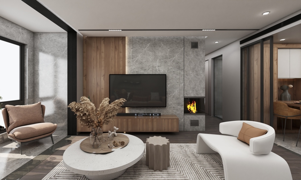 電視背景墻的設計檔次十足,底部的電視柜選擇懸空設計,側方還有個壁爐和大理石結合的造型,看著更為大氣。