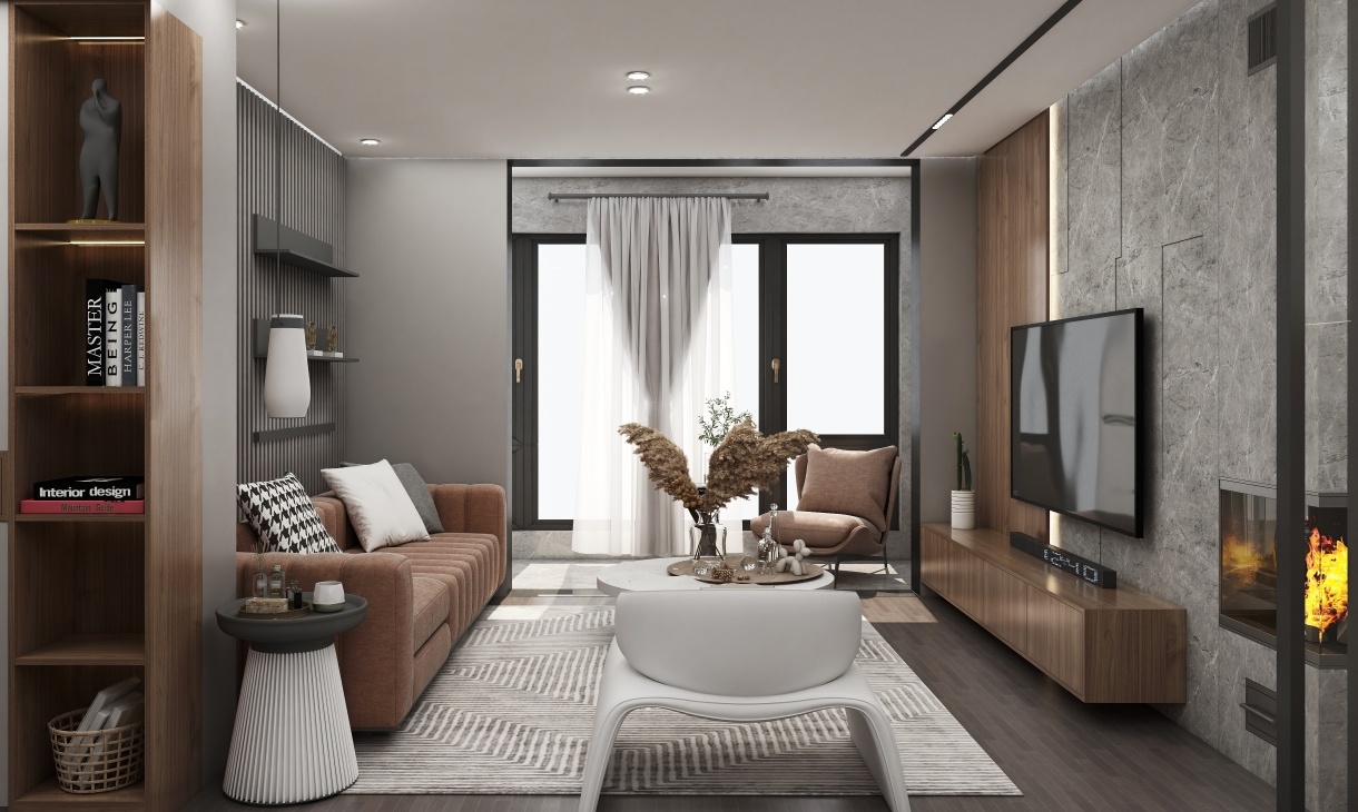 客廳的棕色沙發與電視柜顏色相呼應,白色的茶幾更顯品位,白灰色花紋地毯提升空間格調,紗制窗簾讓整個客廳簡潔又時尚。