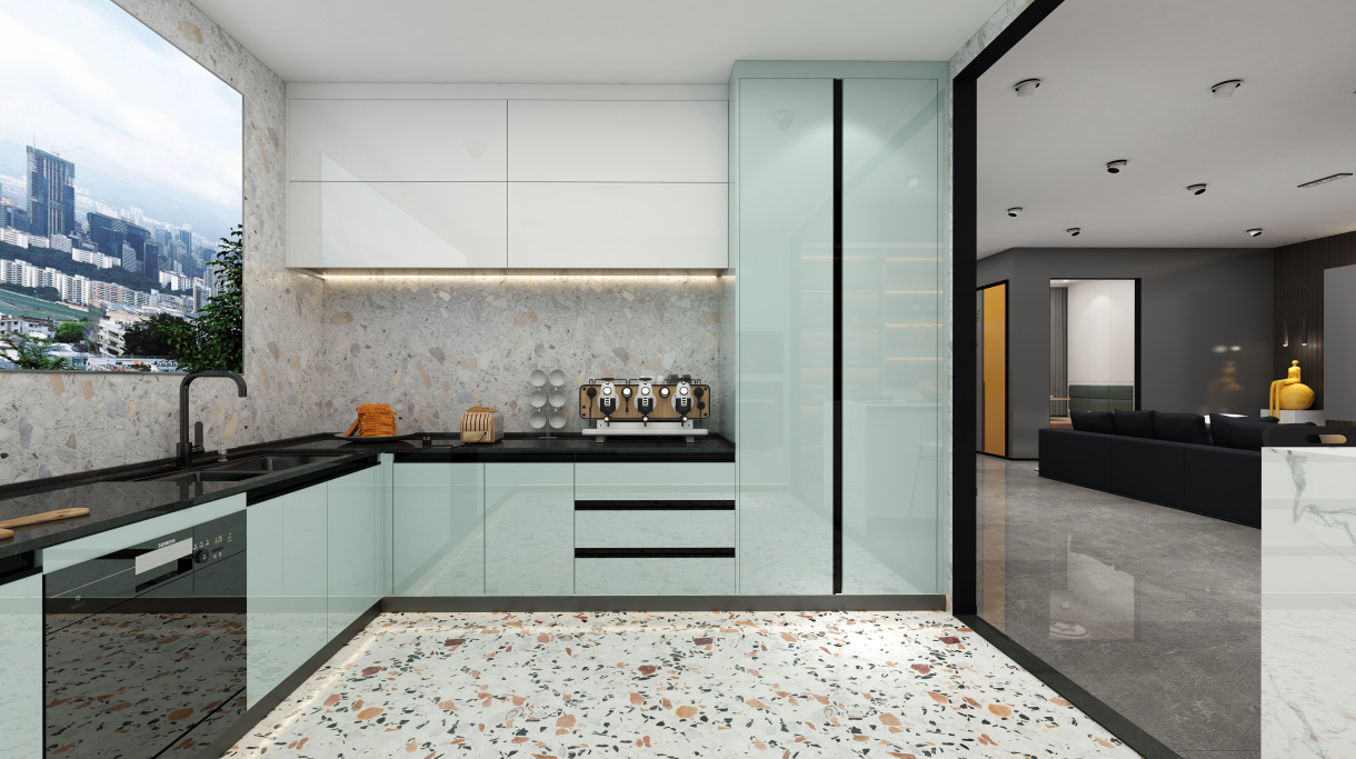 薄荷綠的櫥柜采用隱形拉手,寧靜雅致又高級大氣,黑色的臺面讓廚房更有質感,白色吊柜安裝到頂面可以避免油煙和灰塵的覆蓋,更加整潔。