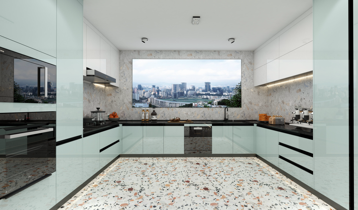 開放式的廚房布局空間盡顯寬敞,整體櫥柜設計收納能力強,隱形拉手設計讓櫥柜表面更齊整,淺色的廚房地面鋪設斑點地板,使得廚房格外上檔次。