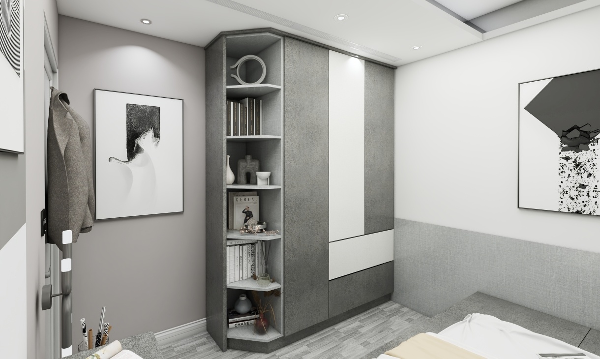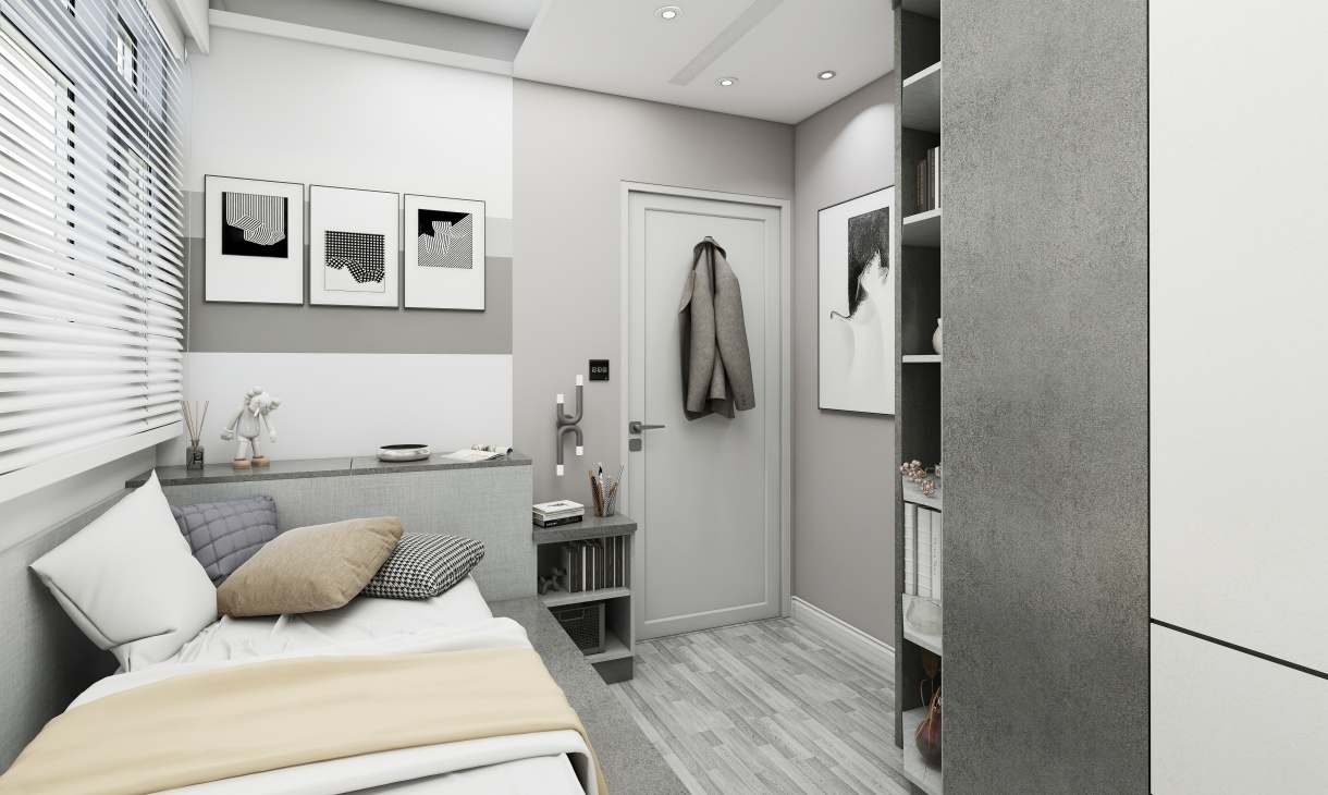 不同深度的灰色的搭配營造出高品位的臥室小空間,到頂的衣柜滿足空間的收納需求,采用灰色和白色拼色設計,視覺上能更靈活大氣。