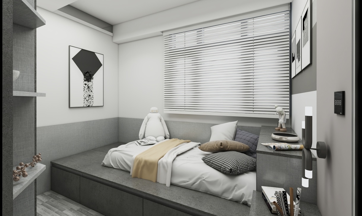 臥室空間不大設計成榻榻米,白色+灰色的搭配更顯品位,墻面最巧妙的設計就是拼接色來展現層次感,鵝黃色的軟飾增加溫馨之感。