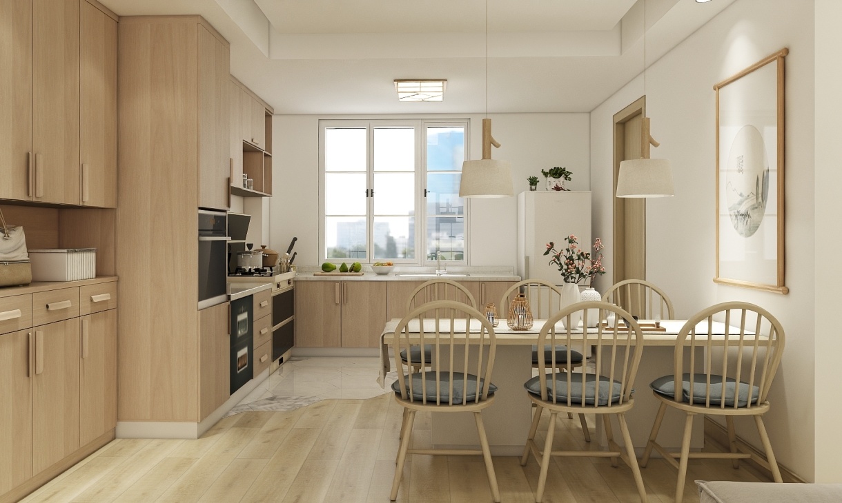 餐廳依舊沿用原木色為主,營造出一種非常舒適的氛圍,墻上的裝飾畫和設計感十足的吊燈以及開放式的廚房,讓本單調的餐廳顯得十分有趣。