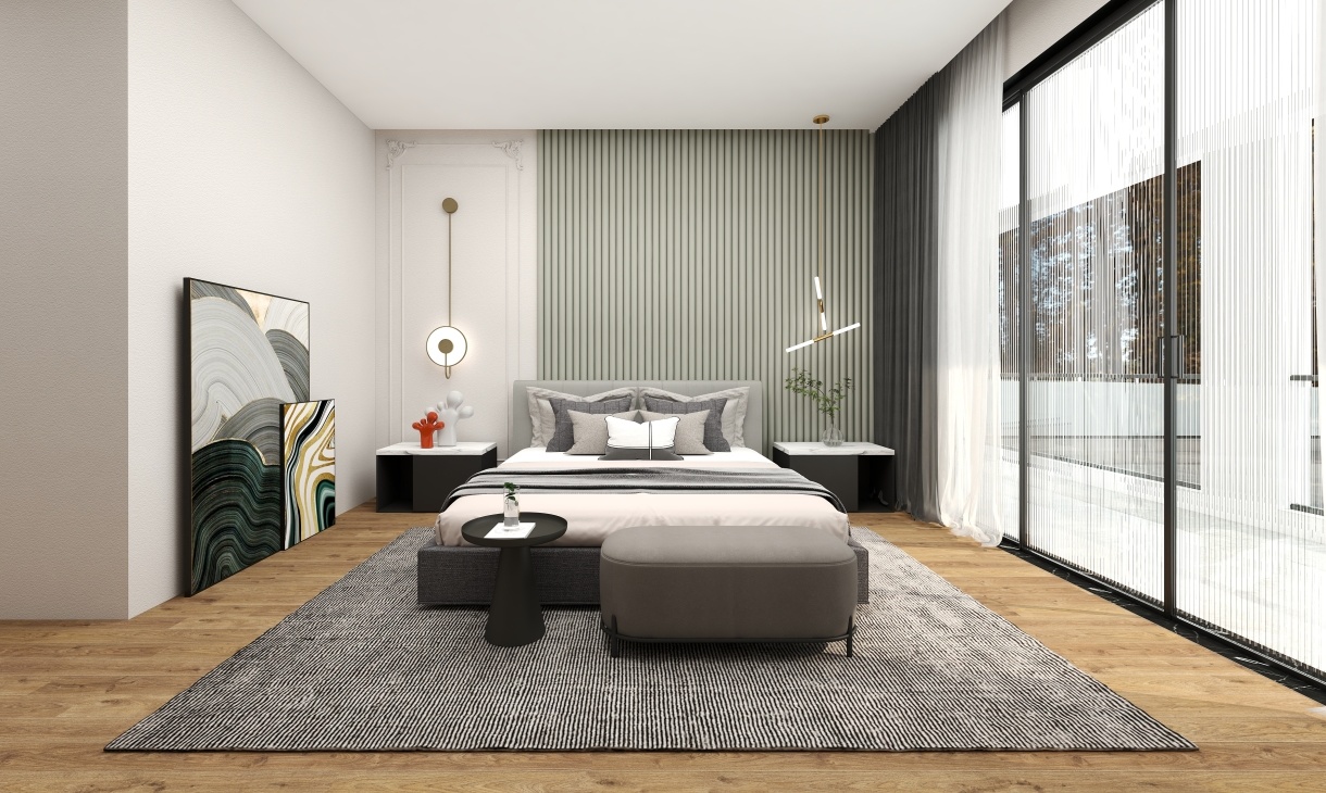 臥室的設計更加簡潔,背景墻用乳膠漆呈現溫馨之感,柔軟舒適的床品又增添了空間的舒適度,整個臥室設計既溫馨又實用。