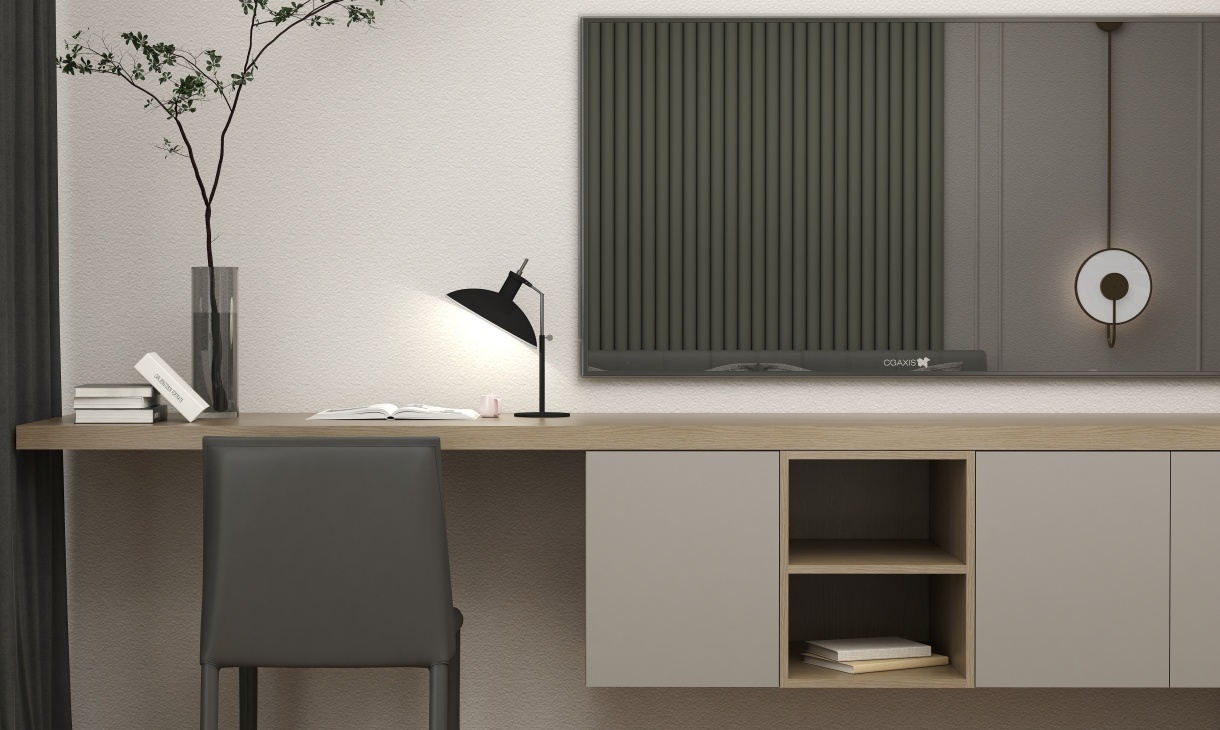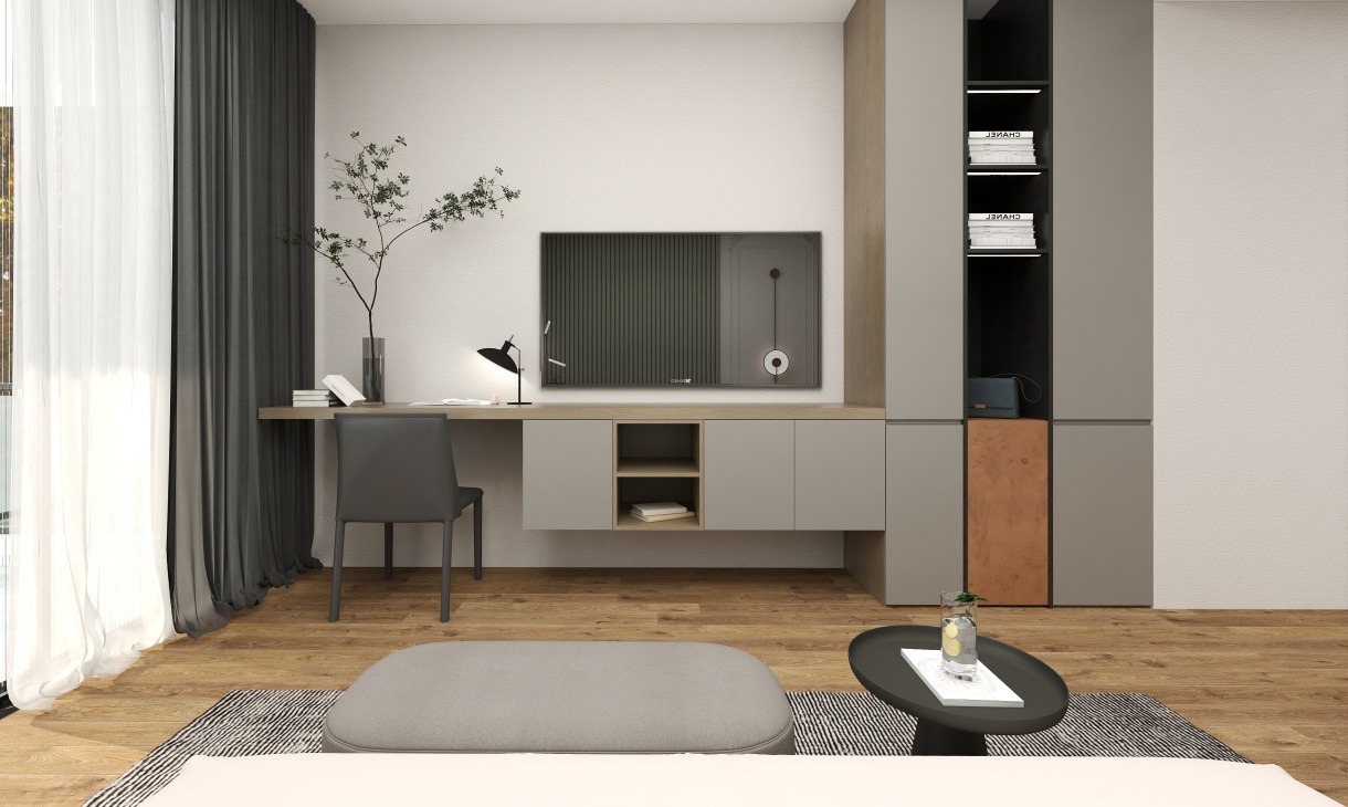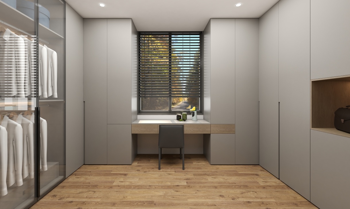 柜門設計隱形拉手,再搭配灰色的地面鋪裝,營造出一種高級上檔次的空間氛圍,靠近窗戶處設計開放格,增強空間的層次感。