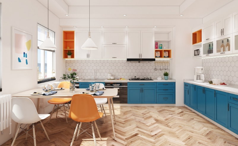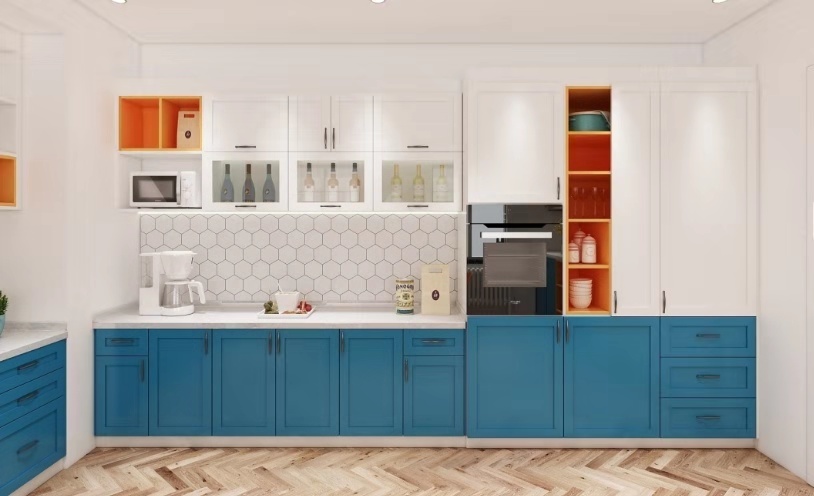 櫥柜的設(shè)計大膽的將藍(lán)和橙兩個冷暖各異的顏色進(jìn)行搭配,讓人驚訝的不僅僅是顏色的碰撞,更多的是新鮮和趣味,深藍(lán)色搭配橙色使空間非常的和諧,搶眼提高整個空間的明亮度,也能帶給空間活躍感,豐富了整個空間的色彩。