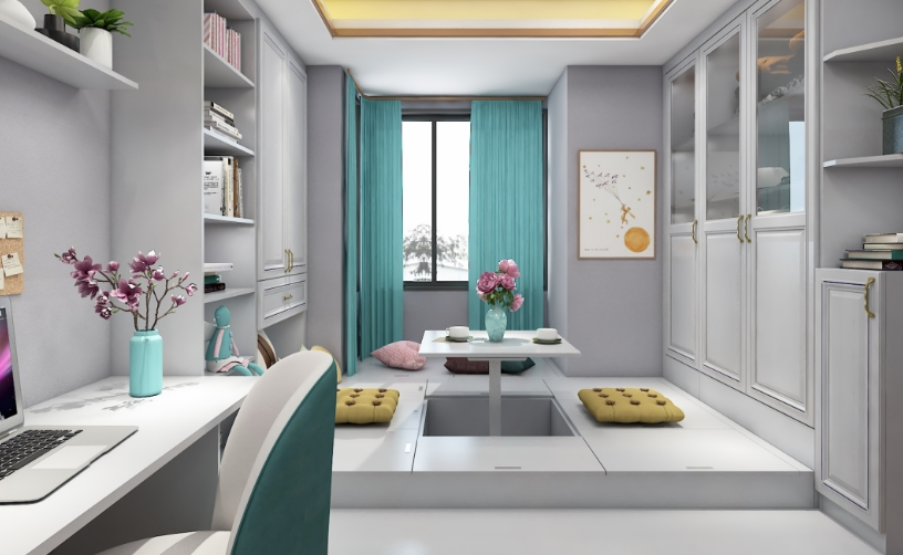 此書(shū)房做了一組榻榻米+書(shū)柜+書(shū)柜+衣柜的組合柜,榻榻米設(shè)計(jì)了升降臺(tái)與高低臺(tái)階,平時(shí)可作為書(shū)房、茶室使用,有客人時(shí)也可作為客臥使用,實(shí)用性非常全面。
