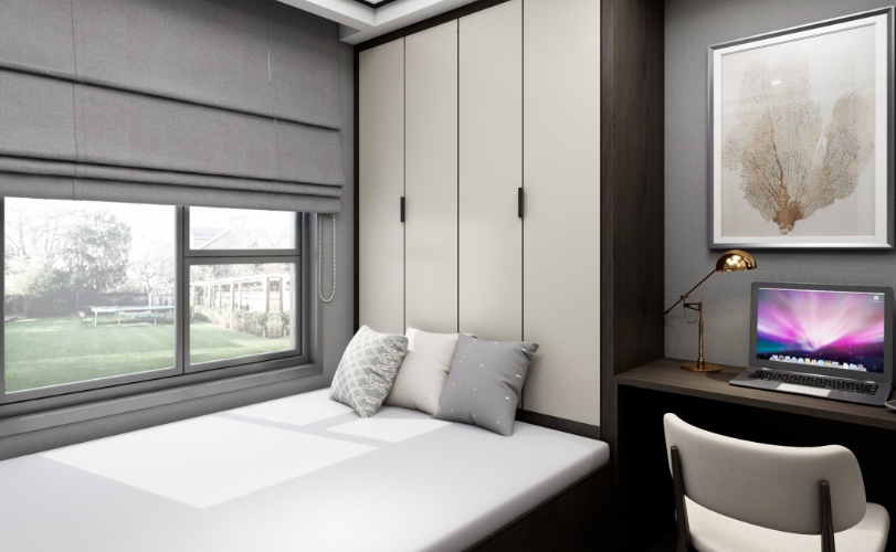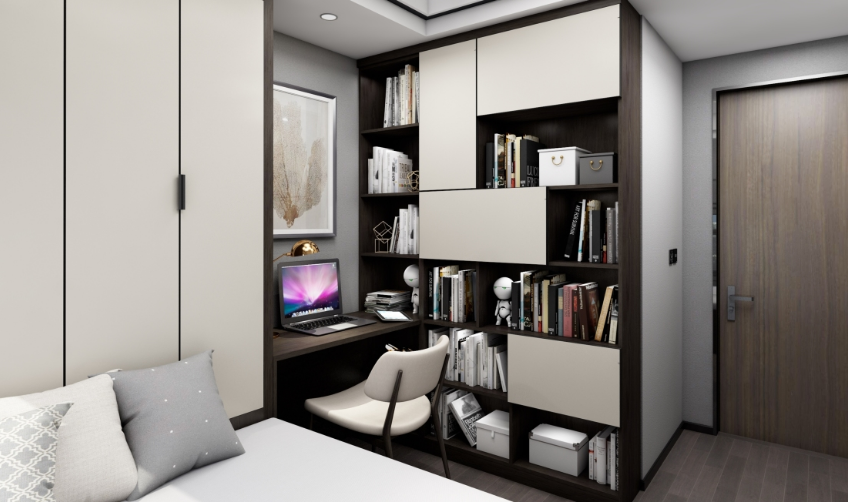 書房亦有客房功能,可以滿足儲物收納,娛樂休閑,放松休息等多種使用需求,簡潔明朗的線條串聯彼此,有呼應亦有區隔,開放格和門板的分割比例,適度有序,期望營造出輕松時尚的現代感。