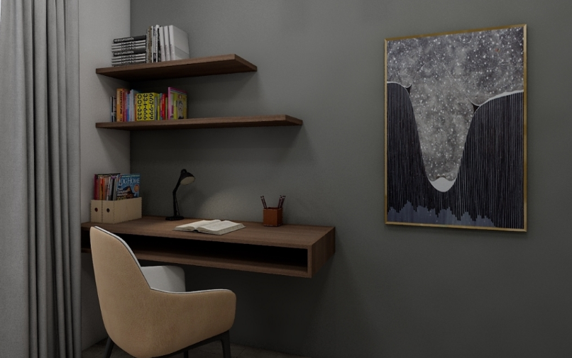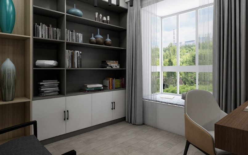 書房的空間設計上鋪裝了淺木地板搭配一整面的定制書柜,書桌跟置物架都使用了簡單的造型,流暢的線條,更貼近現代簡約風格的主題。