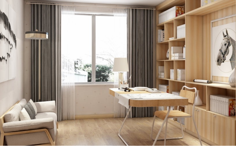 以木料為主設計的書房,空間設計上鋪裝了淺木地板搭配一整面的定制書柜,書桌跟置物架都使用了簡單的造型,流暢的線條,更貼近現(xiàn)代簡約風格的主題。