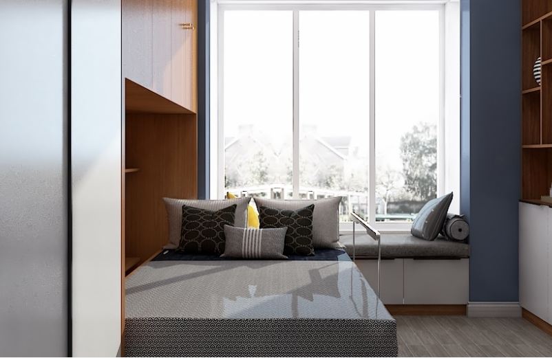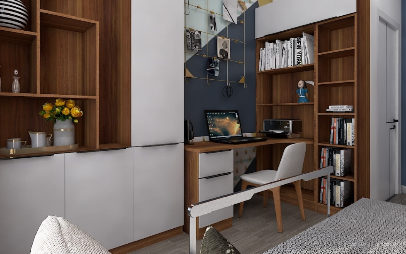 書房設計理念主要圍繞簡約為主,設計成一個多功能房,集合了書房、儲物、客房在一個空間里面,淺色家私與深色面料強烈而時尚,加入適當的色彩融合其中,加強空間的體驗感和時尚感。