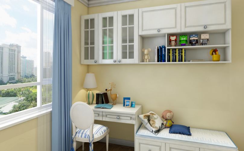 書桌柜與榻榻米結合在一起,在不浪費空間的同時,又有儲藏功能。榻榻米的玩偶與床上的玩偶增加了整個空間的趣味性,滿足空間需求的同時,也給了孩子一個沒有壓力的成長空間。