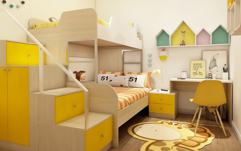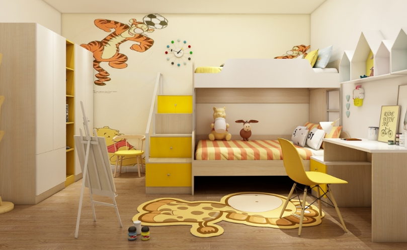 兒童房是一個顏色活躍的區域,主要以“小熊維尼”為原型,大面積應用了黃色,配色向往著活躍,有活力,充分的發揮兒童的構思,上下鋪的設計最大程度上節省類空間,營造出孩子思維,興趣發展的成長空間。