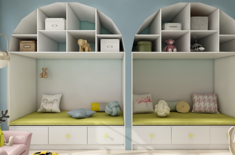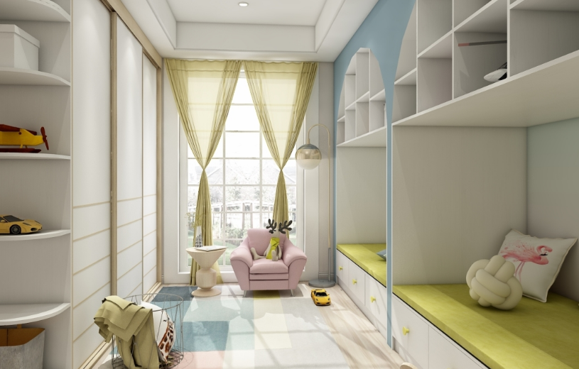 兒童房以配色和材質(zhì)來渲染自然溫馨的氛圍,顏色的搭配彰顯出品味,營造出充滿想象的空間,設(shè)計更年輕化,色彩活潑,簡單時尚,書架和榻榻米的設(shè)計結(jié)合美觀實用。