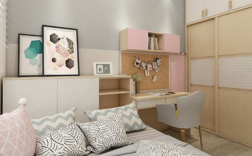 兒童房為榻榻米房間,在孩子成長的過程中,滿足各個(gè)階段的收納需求,既可以作為書房使用,也可以作為睡眠的區(qū)域,多功能為一體。因?yàn)榭紤]到兒童房,柜體臺面也多為圓角處理。