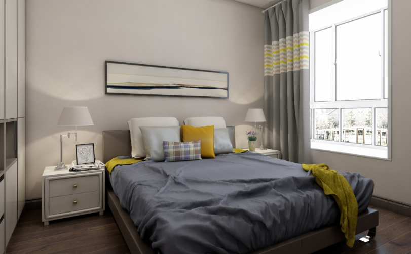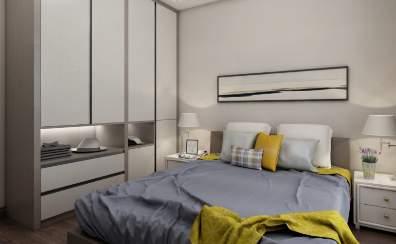 兒童房的設計不一定需要太過花哨,但是一定要有功能性和趣味性,簡約的設計,右側設計一組四門衣柜,滿足兒童的日常收納需求,衣柜設計以珍珠白為主色調,線條簡潔,免拉手設計避免兒童磕碰誤傷,靠近床頭處設計鏤空格,鏤空格放置常用常看的書籍,展示等功能。
