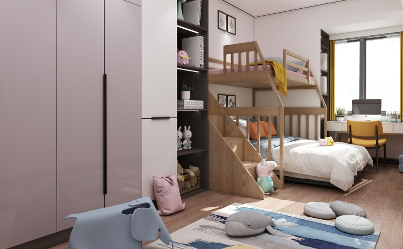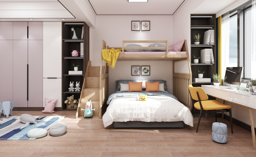 兒童房是一個顏色活躍的區(qū)域,采用里藍色、粉色,配色向往著活躍、夢幻,充分的發(fā)揮兒童的構(gòu)思,上下鋪的設計最大程度上節(jié)省類空間,整個空間的裝飾營造出孩子還有童心,充滿幻想的個性,這樣設計有利于兒童興趣發(fā)展。
