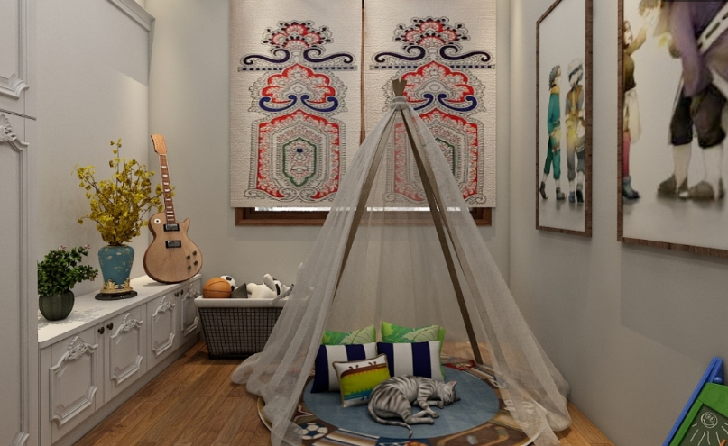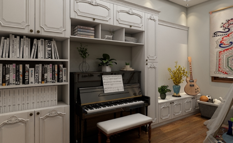 此兒童房主要以歐式高貴為主要設計理念展開的,細節之處包含了歐式家私的華貴,以及設計師的用心,營造出空間感和視覺享受的歐式空間,鋼琴、吉他的擺放,顯得藝術氣息濃郁,另一方面體現出兒童的好學個性,這樣的設計空間有利于兒童的興趣發展。