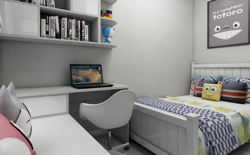以深藍色與灰色營造出潔凈利落的視覺效果,衣柜和書架布局合理,大面積采用淺灰色,玩偶和抱枕艷麗的顏色使得整個空間既溫馨舒適又覺得生機勃勃,使人心曠神怡,每一處都彰顯著質感。