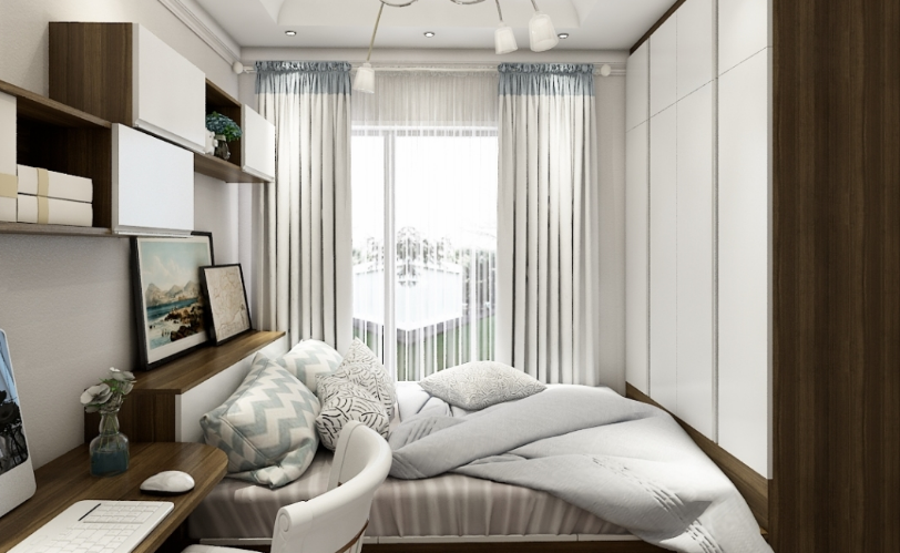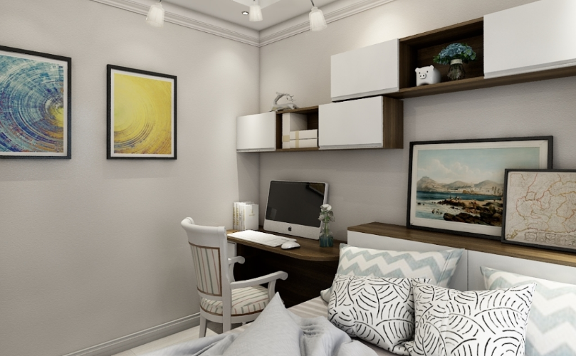 兒童房考慮到童年與青年時期的過渡,設計更年輕化,色彩活潑,簡單時尚,進門右側設計一組衣柜,滿足兒童的日常收納需求,衣柜設計以珍珠白為主色調,線條簡潔,隱形拉手設計安全又美觀。立體書架的設計結合收納工具的擺放,美觀實用。
