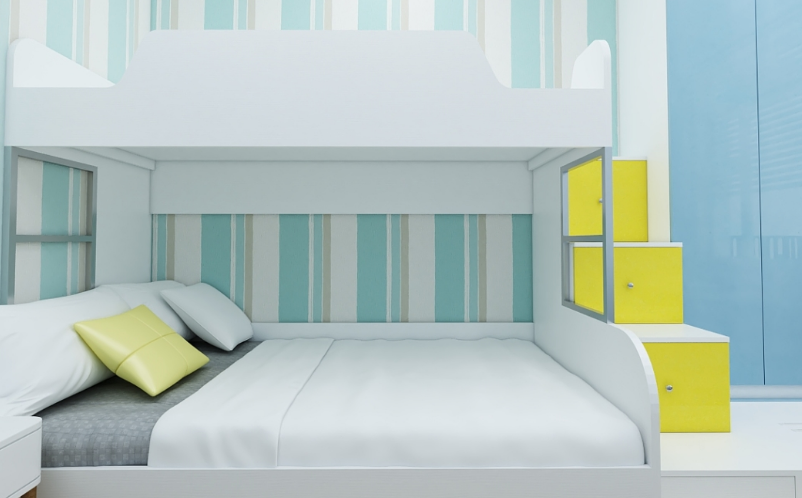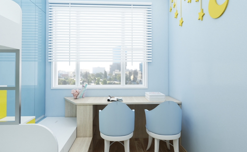兒童房則使用了淺藍、亮黃撞色設(shè)計,再加以大面積淺白色作為協(xié)調(diào)色,這樣即使空間顏色鮮艷也非常耐看,運用藍色與黃色的搭配營造出時尚,活潑的韻味,特別加入的星星月亮裝飾則增添了趣味。