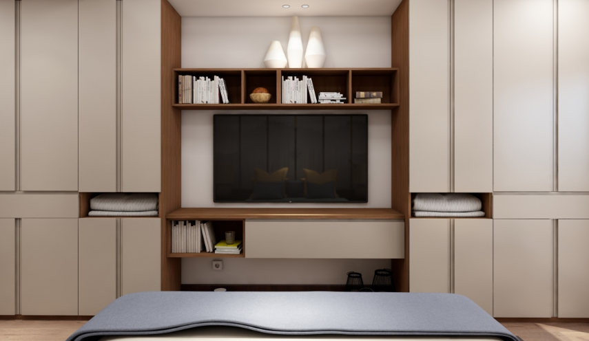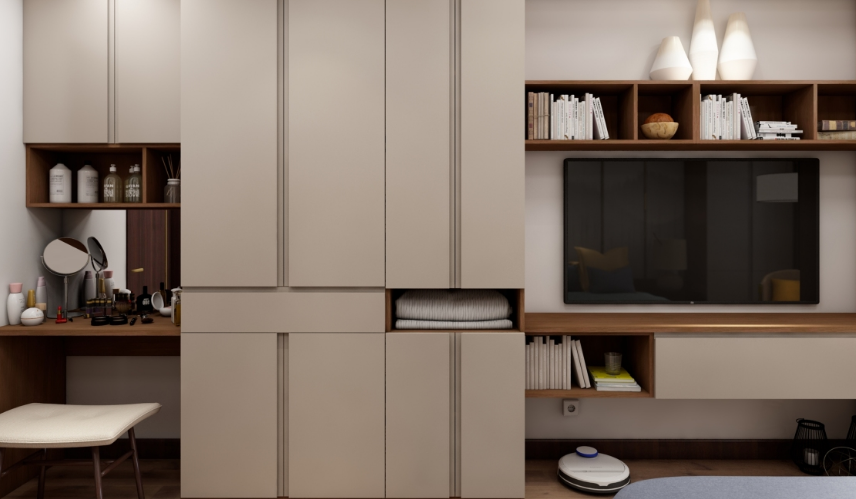 精致的衣柜占據空間一側,沉穩中夾雜活潑,古樸融合現代,是中式與現代融合的真實寫照,兩邊的收納柜作為男女主人的衣柜,有效的分隔開男女的衣物,塑造出了現代而有韻味的空間。
