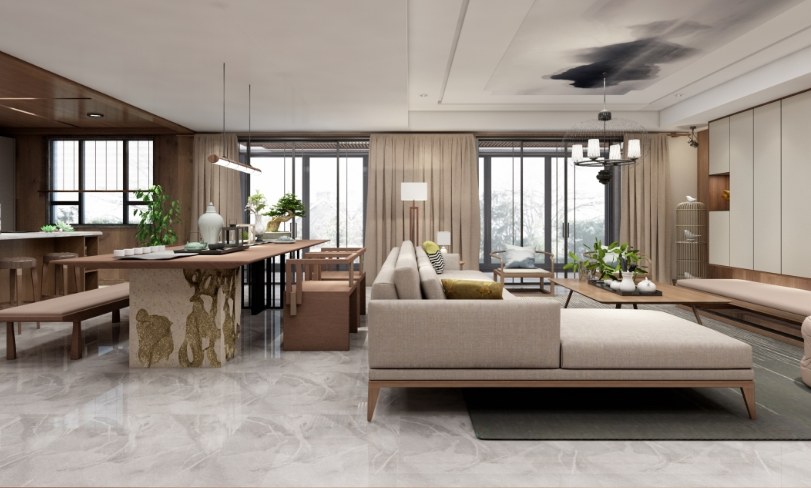 簡(jiǎn)約而不簡(jiǎn)單、素樸而不寒嘇、雅致的格調(diào)、豐富的文化內(nèi)涵,便是新中式風(fēng)格特點(diǎn),在自然元素的融合中,本案的客廳和餐廳都不顯得張揚(yáng)肆意,而在空間布置上,打通廚房,釋放出廚房的空間,空間感更為開闊,自然光自觀景陽臺(tái)落地窗傾瀉而至,為居室鍍上一層暖色光暈,落下滿室溫馨,歲月靜好。