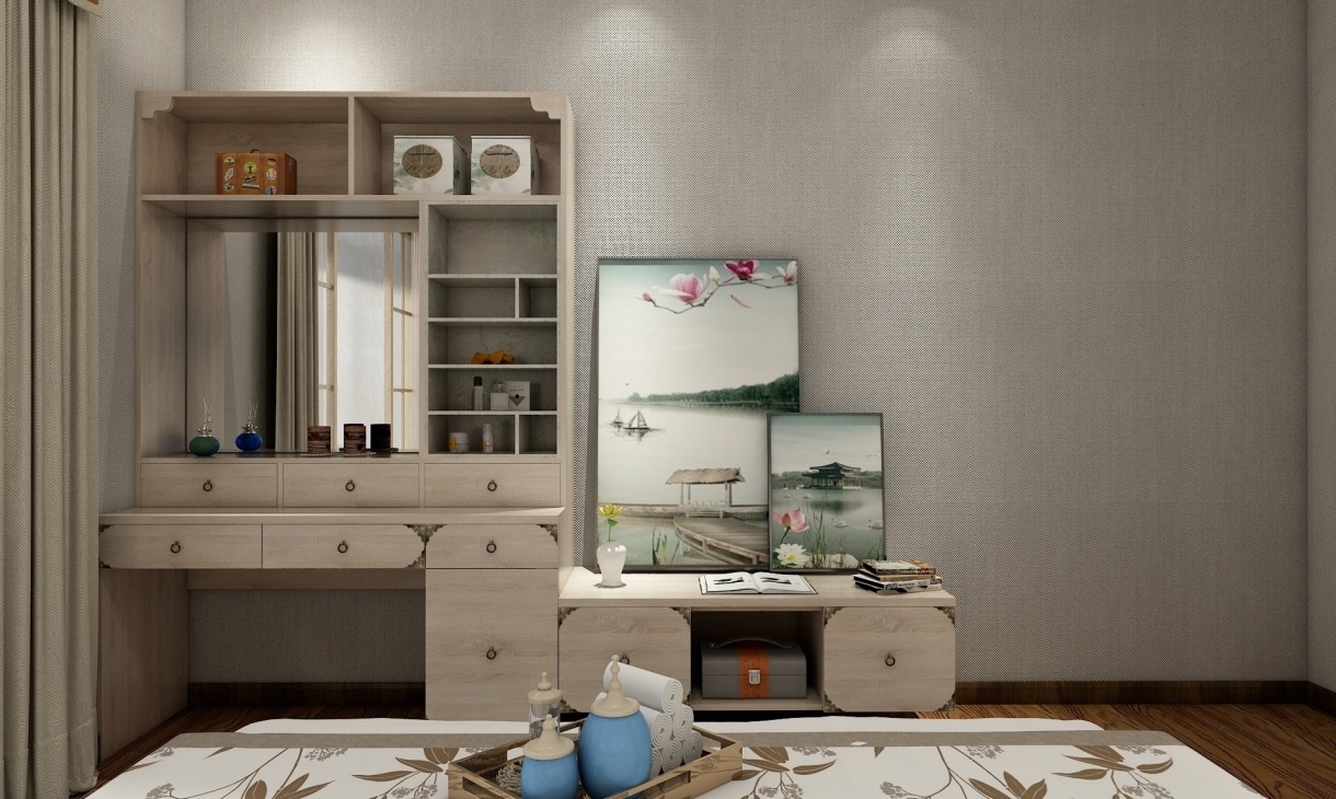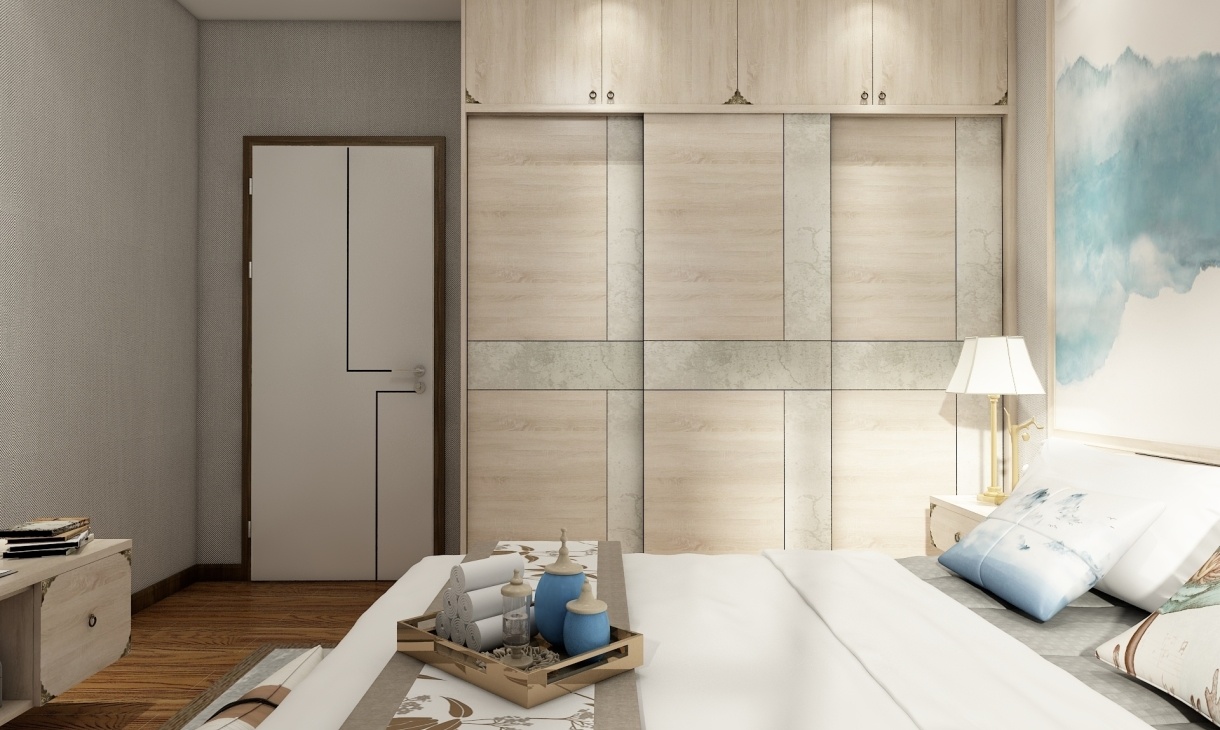 衣柜移門水泥質感及紋路撞色,入眼即是變遷與冷靜,伴隨歲月的洗禮,點綴臥室的藝術與雅致。歲月清洗下的質感,青古銅護角和拉手表面雕刻紋樣,配以擦色工藝,營造古樸中式韻味,散發著凝重深沉的氣質,3D打印的山水畫背景墻,優雅的藍色、還有純潔的白色,使整個空間看起來更有生機,使人感到靜謐。