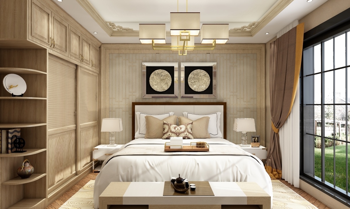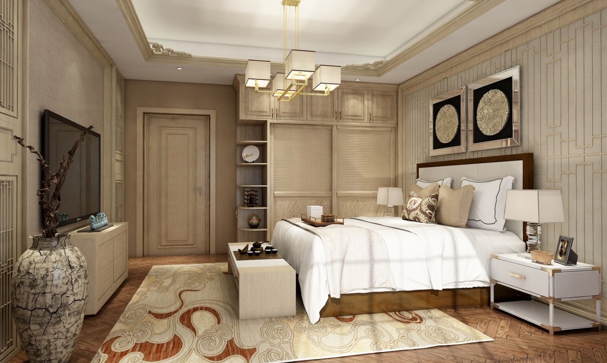 將現代元素和傳統元素結合在一起,以現代人的審美需求來打造富有傳統韻味的事物,提煉了其中經典元素并加以簡化和豐富,該臥室用清新淡雅的木色配上金黃色的點綴,以及地毯上祥云般的花紋,襯托整個空間高貴、雅致。