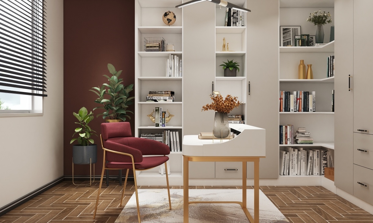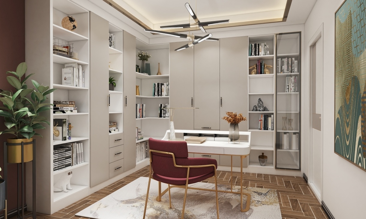 雅致的輕奢,金色是本案的基調,赭紅如同平淡生活中血脈之間始終濃烈的情感,暈染成本案的底色,將書房的底蘊展現在人們面前,激起閱讀欲望。