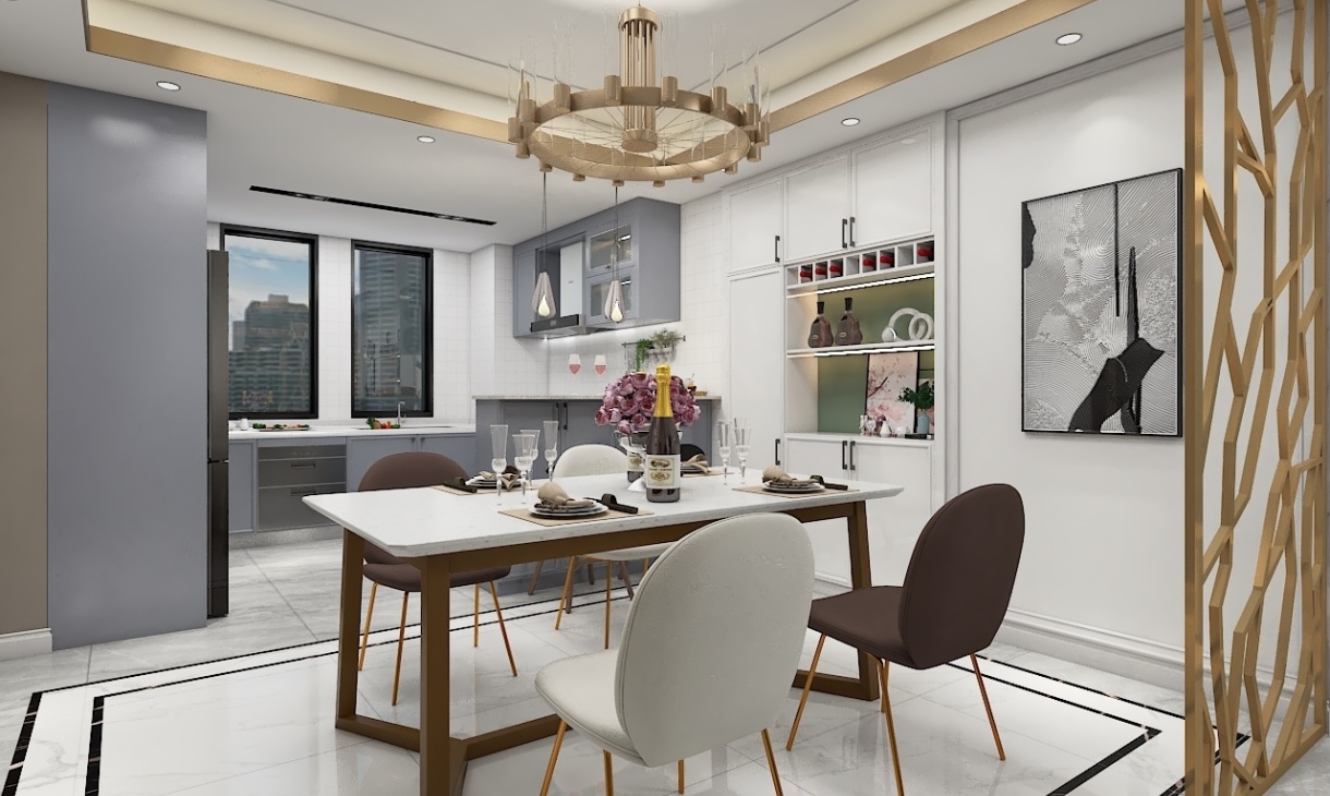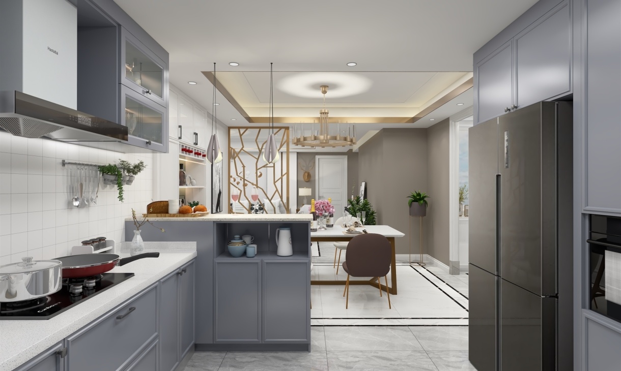 整個廚房空間以灰白色系為主,白色立體櫥柜與灰色櫥柜形成強烈到對比,時尚大氣,櫥柜精致到擺設,提升空間時尚的氣息,通過這些主打元素的連續性使用,以及材質層次豐富的打造,呈現出輕奢的時尚情懷。