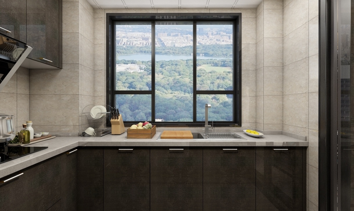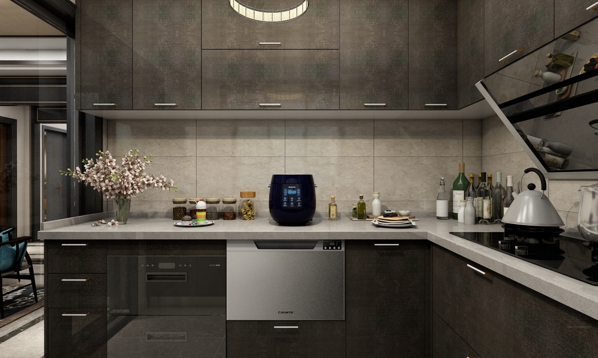 廚房設計十分用心,常用電器也完美的收納在柜體內部,簡潔、美觀、實用,整體色彩及軟裝搭配素雅,去繁就簡,既帶著中式風格的莊重,也不缺乏現代居住溫馨的要求。