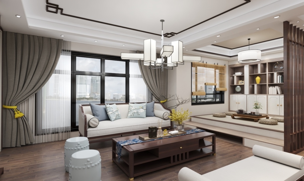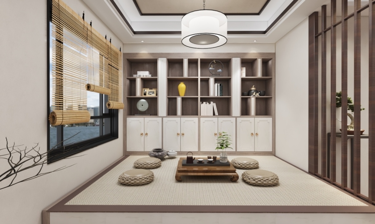 此新中式設計,大膽地摒棄了書房的墻和門,敞開式,與客廳相連,坐在書房可以與客廳的家人有互動溝通,來客人時,也可分坐在客廳和書房、客人需要留宿,放下簾子,拿出棉被,就可作為臥室,書房不再密閉,形成一個多功能的空間。