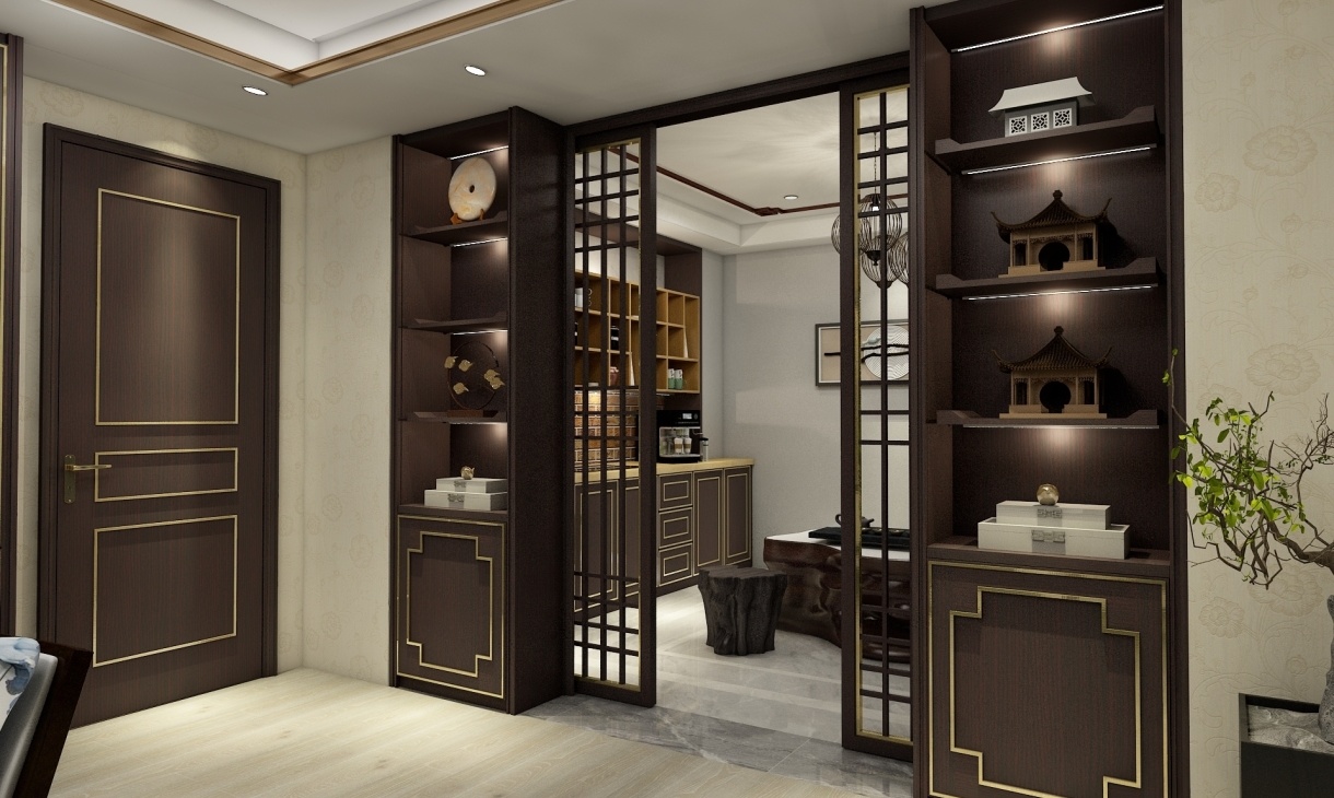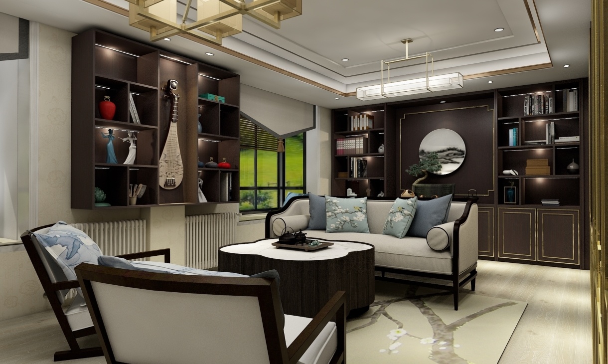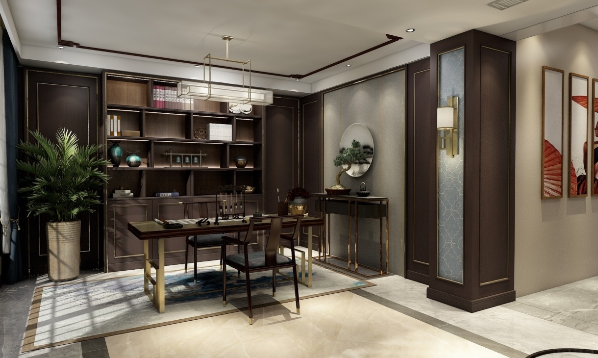 此設計總體布局對稱均衡,端正穩健,在裝飾細節上崇尚自然又富于變化,體現出新中式風格家居,細節之處精致,華麗,一眼便可以看出業主對品質生活的理解和尊重。