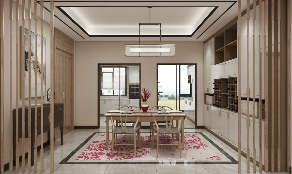 客廳的每一寸空間都極為講究,中式元素與現代材質的巧妙結合,正是“刪繁去奢,繪事后素”,達到“大美無言,大象無形”的氣質感。餐廳運用極具中國特色的屏風,結合中式風格所講究的對稱性。整個空間并不是復古元素的簡單堆砌,而是將家具融合進了中式意境里,方圓之間可見因景互借的韻味。
