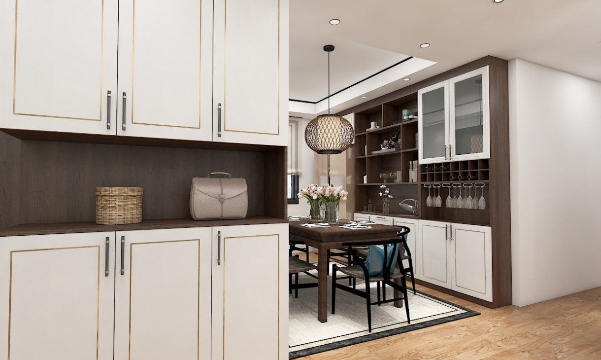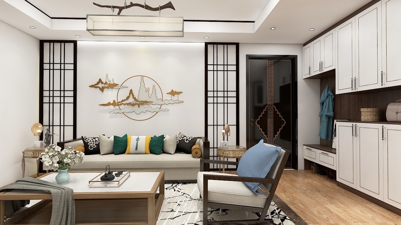 在室內布置、色調及家具陳設造型等方面,吸取傳統文化內涵為設計元素,革除傳統中式家具笨重的弊端,廢棄多余的雕刻,糅合現代居的舒適感。在造型上,以簡單的直線條表現中式的質樸;在色彩上,采用較多柔和的中性色彩。